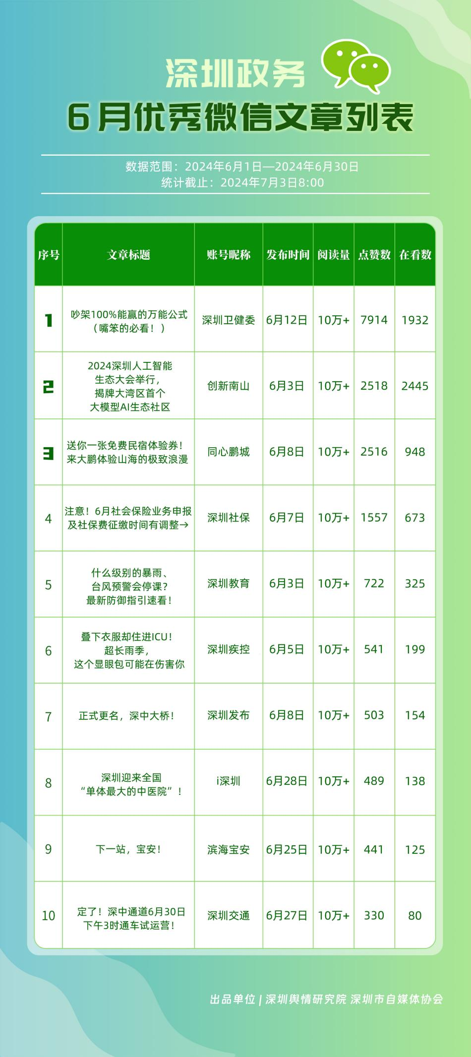 6月,“深圳衛(wèi)健委”“i深圳”“深圳龍崗發(fā)布”“幸福福田”“深圳交通”“深圳教育”“濱海寶安”“創(chuàng)新南山”“深圳工會(huì)”“青春深圳”“同心鵬城”“深圳光明”等30個(gè)政務(wù)微信公眾號,被評為“深圳優(yōu)秀政務(wù)微信公眾號”。6月,“深圳衛(wèi)健委”因內(nèi)容策劃出色、受眾互動(dòng)活躍、作品火熱“出圈”等,榮登排行榜首位?!皠?chuàng)新南山”“同心鵬城”“深圳社保”“深圳教育”等上榜公眾號也積極創(chuàng)作優(yōu)質(zhì)作品,抓住時(shí)下熱點(diǎn)趨勢,集中發(fā)揮政務(wù)媒體傳播力量,推動(dòng)了政務(wù)信息傳播工作提質(zhì)增效。