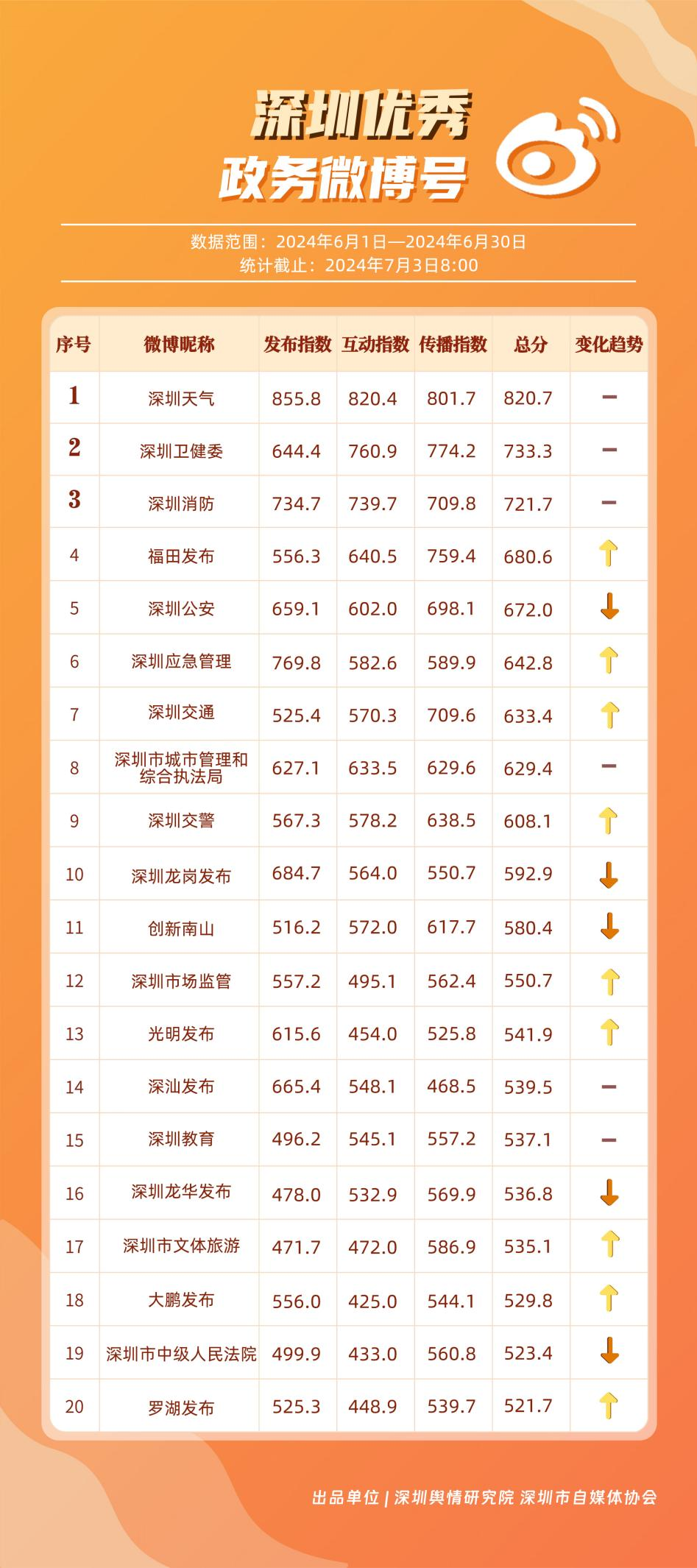 《深圳優(yōu)秀政務(wù)新媒體矩陣》將深圳黨政機(jī)關(guān)、企事業(yè)單位開設(shè)的政務(wù)公眾號(微信)、微博號、抖音號、視頻號(微信)及頭條號按照發(fā)布指數(shù)、互動(dòng)指數(shù)、傳播指數(shù)三項(xiàng)指標(biāo)進(jìn)行綜合評價(jià),最終形成優(yōu)秀名單。