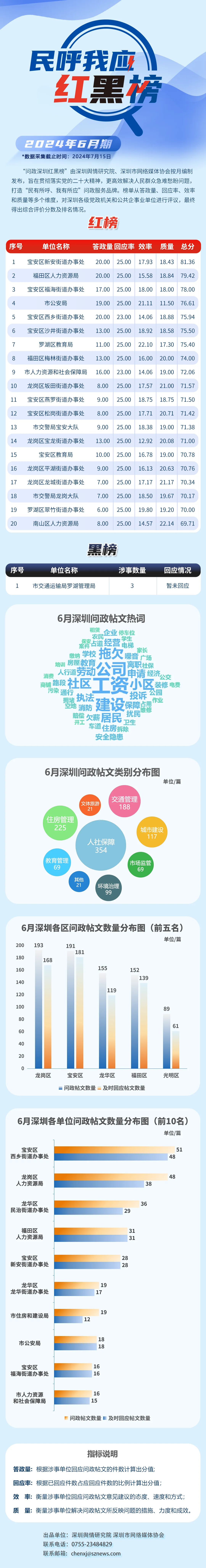 2024年6月,共有20家單位因積極解決民生問(wèn)題,認(rèn)真細(xì)致答政,登上“紅榜”,它們分別是:寶安區(qū)新安街道辦事處、福田區(qū)人力資源局、寶安區(qū)福海街道辦事處、市公安局、寶安區(qū)西鄉(xiāng)街道辦事處、寶安區(qū)沙井街道辦事處、羅湖區(qū)教育局、福田區(qū)梅林街道辦事處、市人力資源和社會(huì)保障局、龍崗區(qū)坂田街道辦事處、寶安區(qū)燕羅街道辦事處、寶安區(qū)松崗街道辦事處、市交警局寶安大隊(duì)、龍崗區(qū)寶龍街道辦事處、寶安區(qū)教育局、龍崗區(qū)平湖街道辦事處、龍崗區(qū)龍城街道辦事處、市交警局龍崗大隊(duì)、羅湖區(qū)翠竹街道辦事處、南山區(qū)人力資源局。另外,市交通運(yùn)輸局羅湖管理局因相關(guān)帖文回應(yīng)率偏低,整體答政效果不佳,被列入“黑榜”。