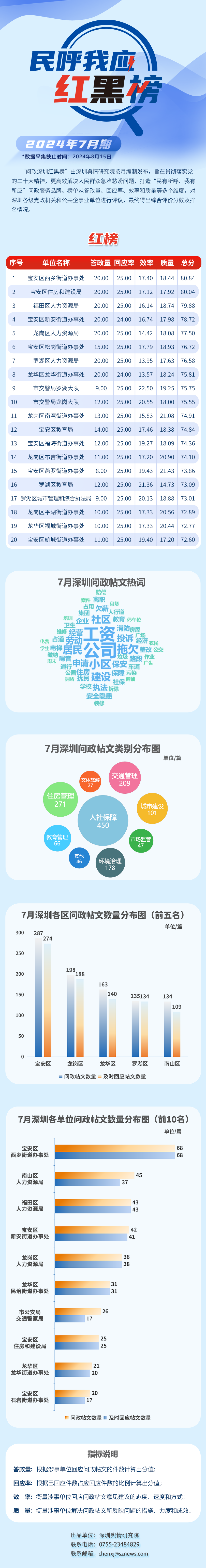 本期榜單采集的帖文主要來(lái)自深圳市及各區(qū)政府官網(wǎng)、深圳論壇、人民網(wǎng)領(lǐng)導(dǎo)留言板、深圳新聞網(wǎng)“民呼我應(yīng)”等平臺(tái),所采集帖文發(fā)布時(shí)間為2024年7月1日至7月31日,采集截止時(shí)間為2024年8月15日。