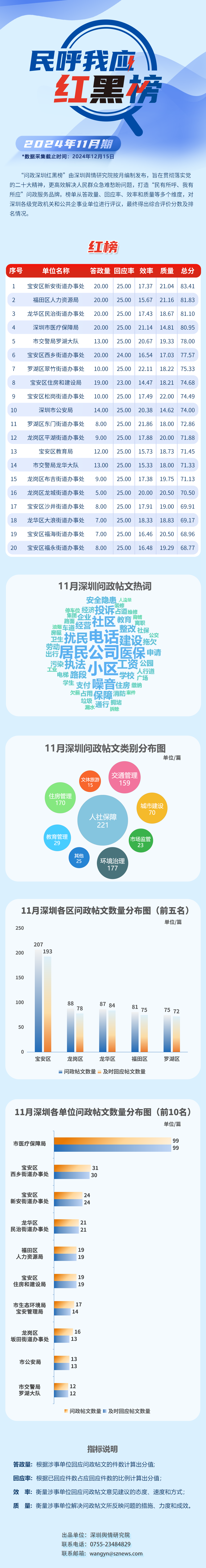 “深圳民呼我應(yīng)紅黑榜”由深圳輿情研究院按月編制發(fā)布,旨在貫徹落實黨的二十大精神,更高效解決人民群眾急難愁盼問題,打造“民有所呼、我有所應(yīng)”問政服務(wù)品牌。榜單從答政量、回應(yīng)率、效率和質(zhì)量等多個維度對深圳各級黨政機關(guān)和公共企事業(yè)單位進行評議,最終得出綜合評價分數(shù)及排名情況。