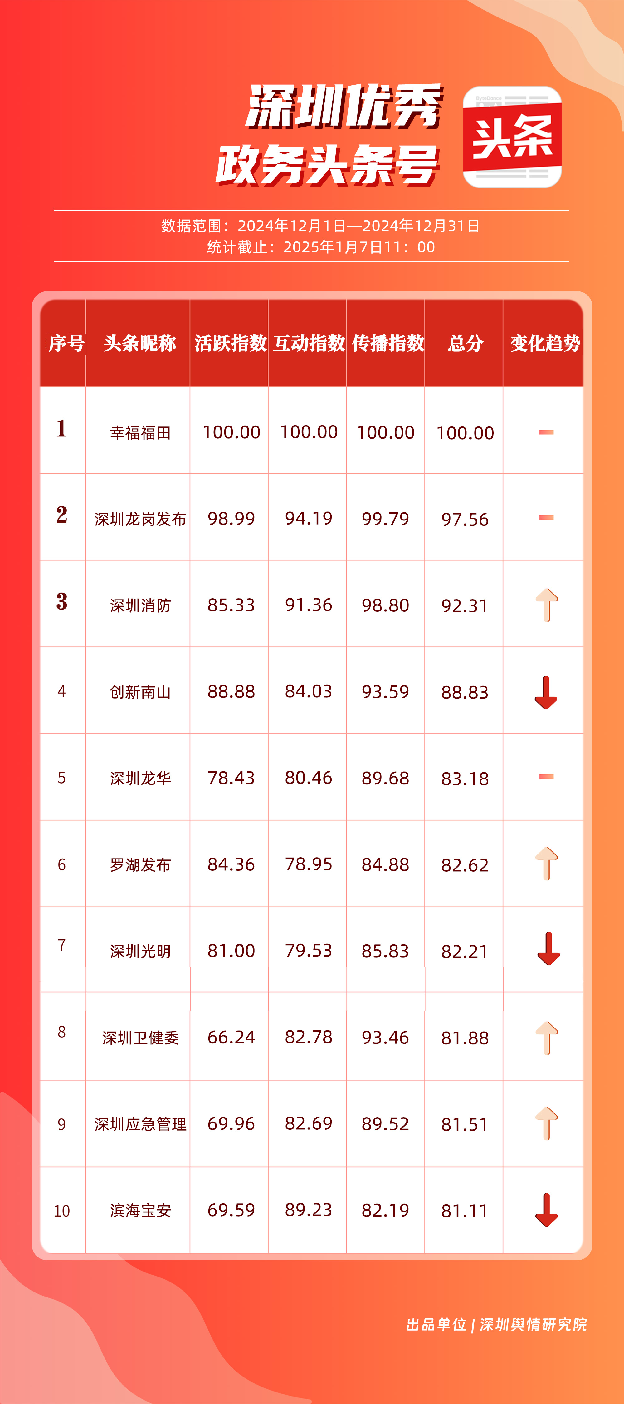 12月,“幸福福田”“深圳龍崗發(fā)布”“深圳消防”“創(chuàng)新南山”“深圳龍華”“羅湖發(fā)布”“深圳光明”“深圳衛(wèi)健委”“深圳應(yīng)急管理”“濱海寶安”共10個(gè)政務(wù)頭條號(hào)入選“優(yōu)秀政務(wù)頭條號(hào)”榜單。對(duì)比其他賬號(hào),“幸福福田”在各方面均取得較好成績(jī),居于榜單第一位置。“深圳龍崗發(fā)布”以97.56分位于榜單第二名,其傳播指數(shù)得分為99.79分,反映出賬號(hào)在信息傳播范圍方面存在明顯優(yōu)勢(shì)。此外,賬號(hào)“深圳消防”“創(chuàng)新南山”“深圳龍華”也為市民提供便捷、高效的政務(wù)信息,位于榜單前五名。