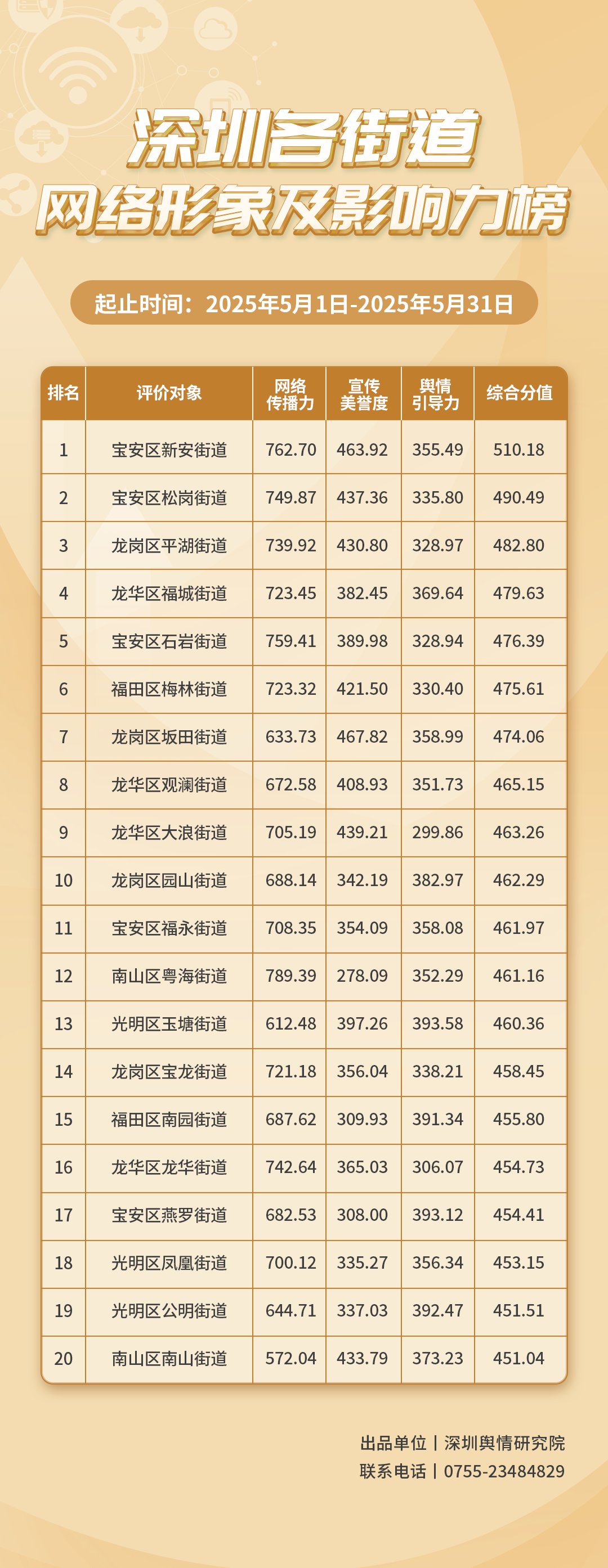 2025年,各街道積極探索網(wǎng)絡(luò)社交平臺(tái)的傳播特色,進(jìn)一步深化完善基層治理。《深圳各街道網(wǎng)絡(luò)形象及影響力榜》(5月榜單)對(duì)各街道在網(wǎng)絡(luò)空間的展現(xiàn)及其影響力進(jìn)行觀察與評(píng)估。本次榜單的數(shù)據(jù)統(tǒng)計(jì)時(shí)間跨度為2025年5月1日至5月31日。