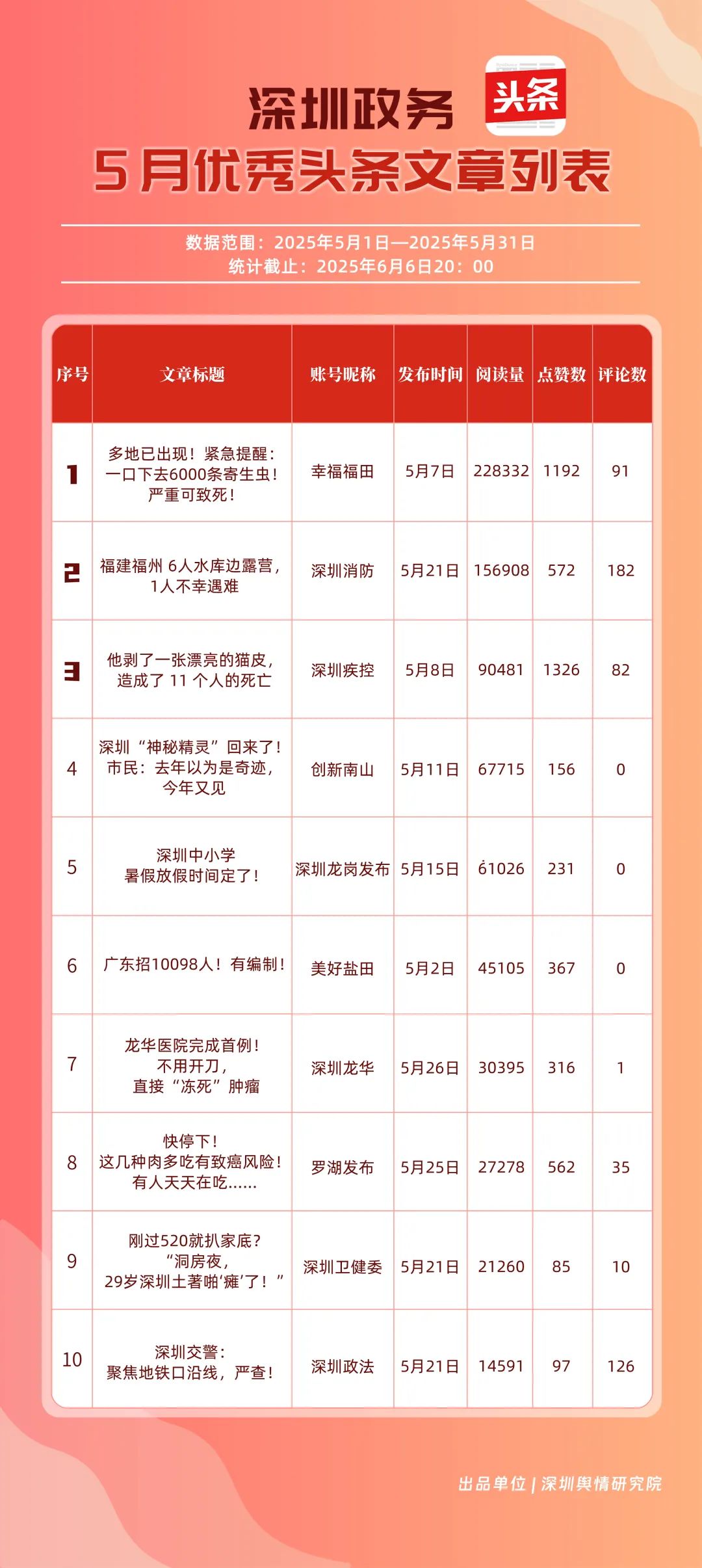 5月,“幸福福田”“深圳消防”“創(chuàng)新南山”“深圳疾控”“羅湖發(fā)布”“深圳龍崗發(fā)布”“坪山發(fā)布”“青春深圳”“深圳龍華”“深圳人社”共10個政務(wù)頭條號入選“優(yōu)秀政務(wù)頭條號”榜單。在榜單前三名中,“幸福福田”“創(chuàng)新南山”以穩(wěn)定且高質(zhì)量的內(nèi)容輸出,持續(xù)領(lǐng)跑,排名較上個月未發(fā)生變動。位居榜單第二的“深圳消防”同樣表現(xiàn)亮眼,排名較上個月提升2個名次,充分展現(xiàn)了其在消防安全宣傳領(lǐng)域的持續(xù)深耕和創(chuàng)新突破。上榜政務(wù)頭條號各展所長,以優(yōu)質(zhì)內(nèi)容為核心,充分發(fā)揮平臺傳播優(yōu)勢,為政務(wù)信息的高效觸達(dá)與廣泛傳播樹立了標(biāo)桿。