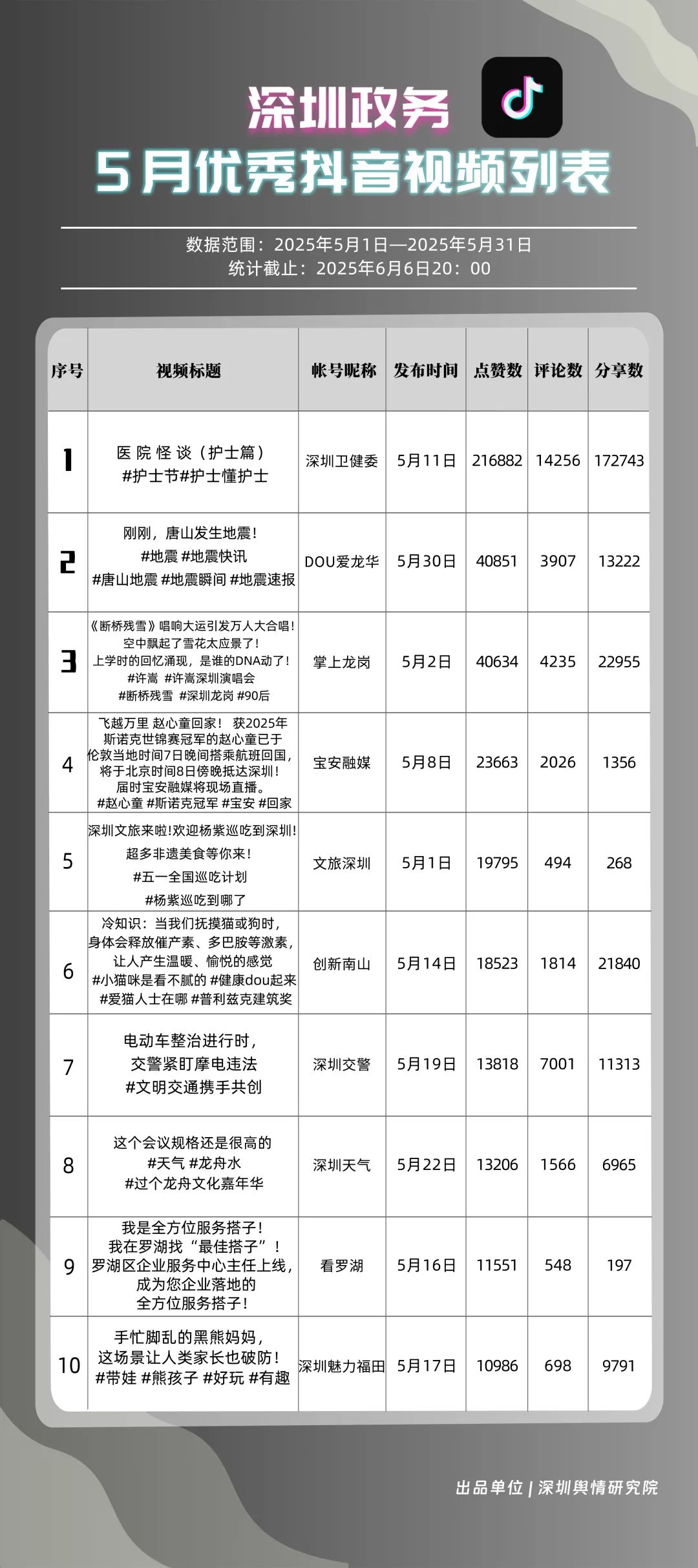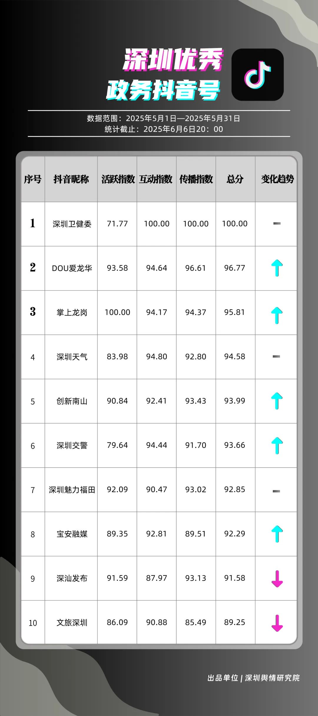 5月,“深圳衛(wèi)健委”“DOU愛龍華”“掌上龍崗”“深圳天氣”“創(chuàng)新南山”“深圳交警”“深圳魅力福田”“寶安融媒”“深汕發(fā)布”“文旅深圳”共10個政務(wù)抖音號獲得“優(yōu)秀政務(wù)抖音號”稱號。5月,“深圳衛(wèi)健委”憑借3條極具創(chuàng)意的視頻內(nèi)容持續(xù)收獲網(wǎng)民關(guān)注,穩(wěn)居榜首之位,成為政務(wù)抖音號領(lǐng)域的標(biāo)桿?!癉OU愛龍華”“掌上龍崗”較上個月排名大幅度上升,以96.77分和95.81分位居榜單第2、3名,彰顯出積極探索創(chuàng)新傳播路徑、開拓政務(wù)短視頻發(fā)展新可能的決心。以上優(yōu)秀政務(wù)抖音號通過多樣化的短視頻形式傳遞政務(wù)資訊,為深圳政務(wù)新媒體在短視頻領(lǐng)域的蓬勃發(fā)展注入強(qiáng)勁動能,成為政務(wù)信息傳播的新標(biāo)桿。