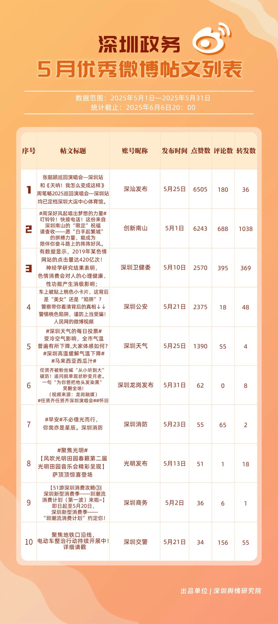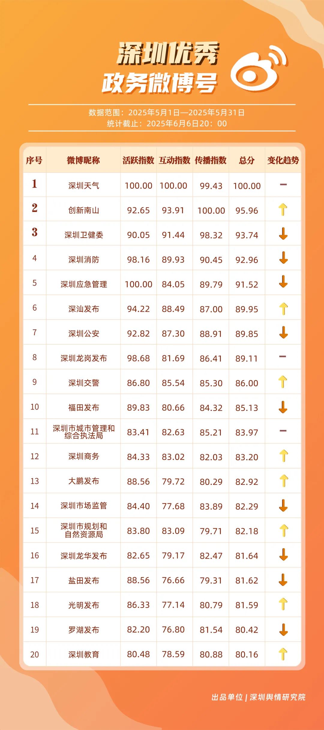 5月,“深圳天氣”“創(chuàng)新南山”“深圳衛(wèi)健委”“深圳消防”“深圳應(yīng)急管理”“深汕發(fā)布”“深圳公安”“深圳龍崗發(fā)布”“深圳交警”“福田發(fā)布”等20個賬號入選“優(yōu)秀政務(wù)微博號”。其中,“深圳天氣”憑借活躍指數(shù)和互動指數(shù)雙項滿分的亮眼成績,穩(wěn)居榜單首位。“創(chuàng)新南山”以95.96分緊隨其后,在互動、傳播指數(shù)得分大幅提升,排名實現(xiàn)顯著躍升?!吧钲谛l(wèi)健委”“深圳消防”“深圳應(yīng)急管理”也表現(xiàn)卓越,總分均超過90分,它們憑借權(quán)威信息發(fā)布、專業(yè)知識科普,展現(xiàn)了各單位在民生服務(wù)、公共安全領(lǐng)域的重要作用。以上優(yōu)秀政務(wù)微博號深度契合平臺的傳播特征,善于借助熱門話題擴(kuò)大影響力,以鮮明的賬號特色展現(xiàn)區(qū)域風(fēng)采。