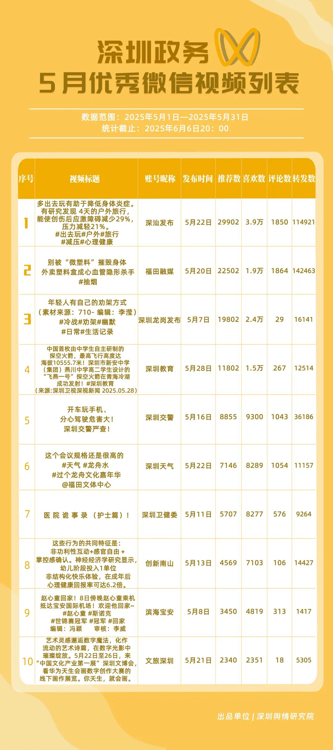 5月,獲得“深圳優(yōu)秀政務(wù)微信視頻號”稱號的是“深汕發(fā)布”“福田融媒”“深圳龍崗發(fā)布”“創(chuàng)新南山”“深圳交警”“深圳衛(wèi)健委”“深圳天氣”“深圳教育”“濱海寶安”“青春深圳”。其中,“深汕發(fā)布”保持了熱點(diǎn)內(nèi)容輸出的穩(wěn)定性和時效性,延續(xù)了上個月的優(yōu)異表現(xiàn)。“福田融媒”“深圳龍崗發(fā)布”排名緊隨其后,其中“深圳龍崗發(fā)布”在互動指數(shù)方面獲得滿分,搭建了高效的政民互動橋梁。這些優(yōu)秀的政務(wù)微信視頻號以各自的優(yōu)勢,展現(xiàn)出深圳政務(wù)新媒體矩陣在視頻傳播賽道的蓬勃活力,為政務(wù)信息傳播開辟更親民和高效的賽道。