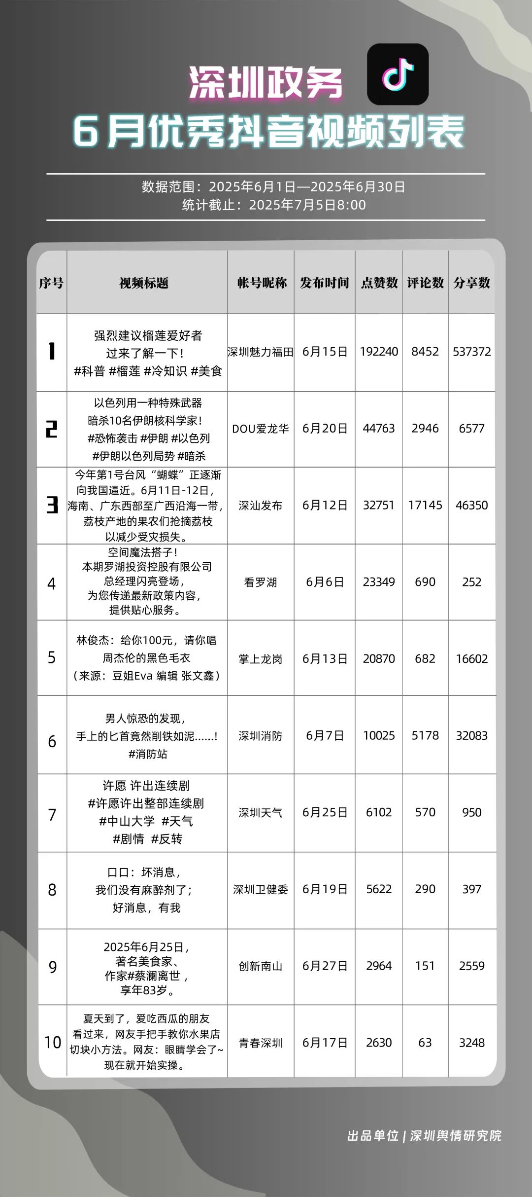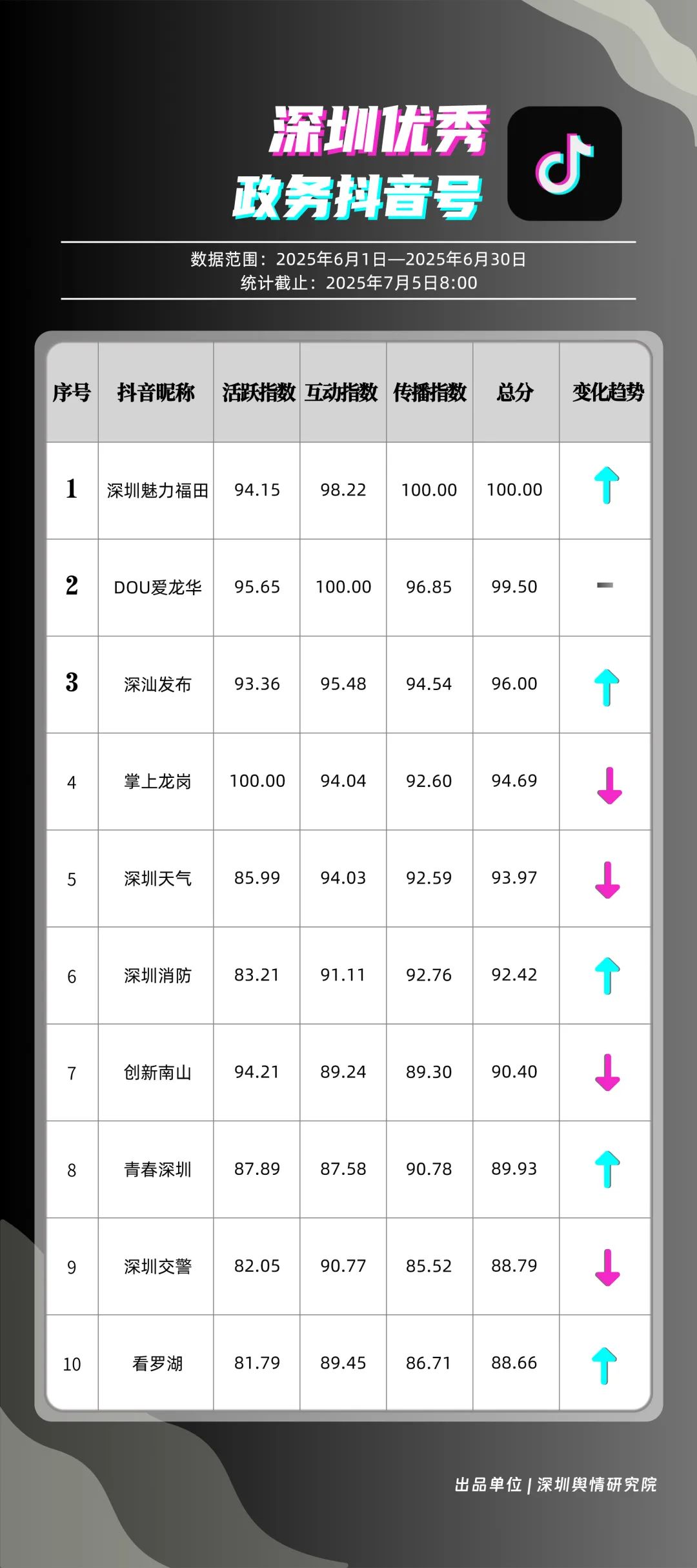 6月,“深圳魅力福田”“DOU愛龍華”“深汕發(fā)布”“掌上龍崗”“深圳天氣”“深圳消防”“創(chuàng)新南山”“青春深圳”“深圳交警”“看羅湖”共10個(gè)政務(wù)抖音號獲得“優(yōu)秀政務(wù)抖音號”稱號。6月,“深圳魅力福田”登頂,憑借其城市人文、社會熱點(diǎn)類主題短視頻,在傳播指數(shù)得分創(chuàng)新高;“DOU愛龍華”“深汕發(fā)布”“掌上龍崗”緊隨其后,通過各類熱點(diǎn)、創(chuàng)意內(nèi)容提升傳播效能。“深圳天氣”“深圳消防”也表現(xiàn)突出,短視頻內(nèi)容兼具“信息傳遞”與“情感共鳴”,用戶參與度持續(xù)提升,不斷為網(wǎng)民傳播有價(jià)值的政務(wù)信息資訊。