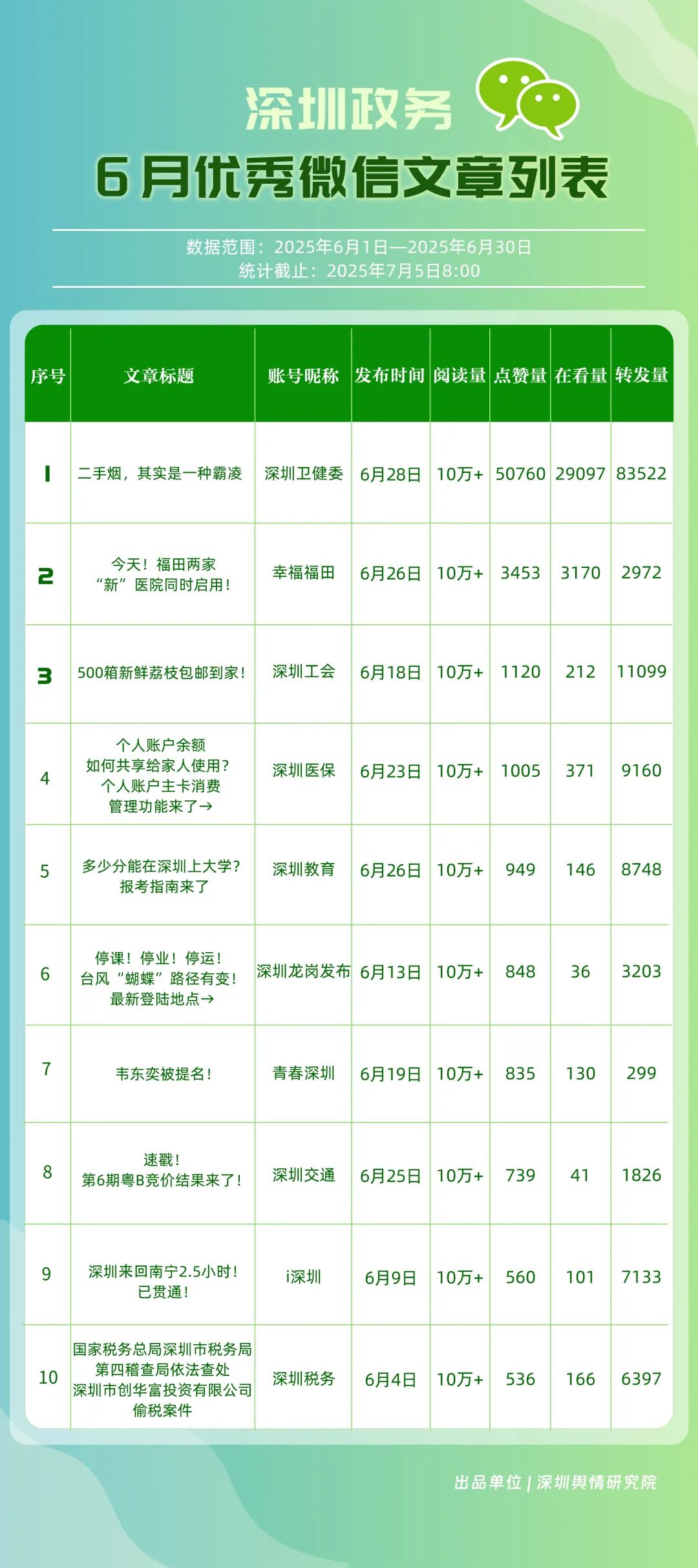 6月,30個(gè)政務(wù)微信公眾號入選“深圳優(yōu)秀政務(wù)微信公眾號”榜單,其中包括“深圳衛(wèi)健委”“幸福福田”“深圳龍崗發(fā)布”“i深圳”“創(chuàng)新南山”“青春深圳”“深圳光明”“深圳教育”“深圳龍華”“深圳工會”等。6月,榜單前三名的賬號保持穩(wěn)定,且各創(chuàng)作出多篇閱讀量超10萬次的優(yōu)質(zhì)文章,傳播指數(shù)得分均在100分以上?!吧钲谛l(wèi)健委”持續(xù)位居榜首,內(nèi)容專業(yè)性與傳播力持續(xù)領(lǐng)跑;“幸福福田”以92.94分位居第二,得分較5月有所提高?!吧钲邶垗彴l(fā)布”“i深圳”“創(chuàng)新南山”也積極發(fā)布民生服務(wù)與宣傳活動(dòng)內(nèi)容,排名靠前。上榜賬號整體呈現(xiàn)“內(nèi)容精品化、服務(wù)場景化”特點(diǎn),持續(xù)優(yōu)化信息供給質(zhì)量,為用戶打造有深度的政務(wù)信息服務(wù)矩陣。