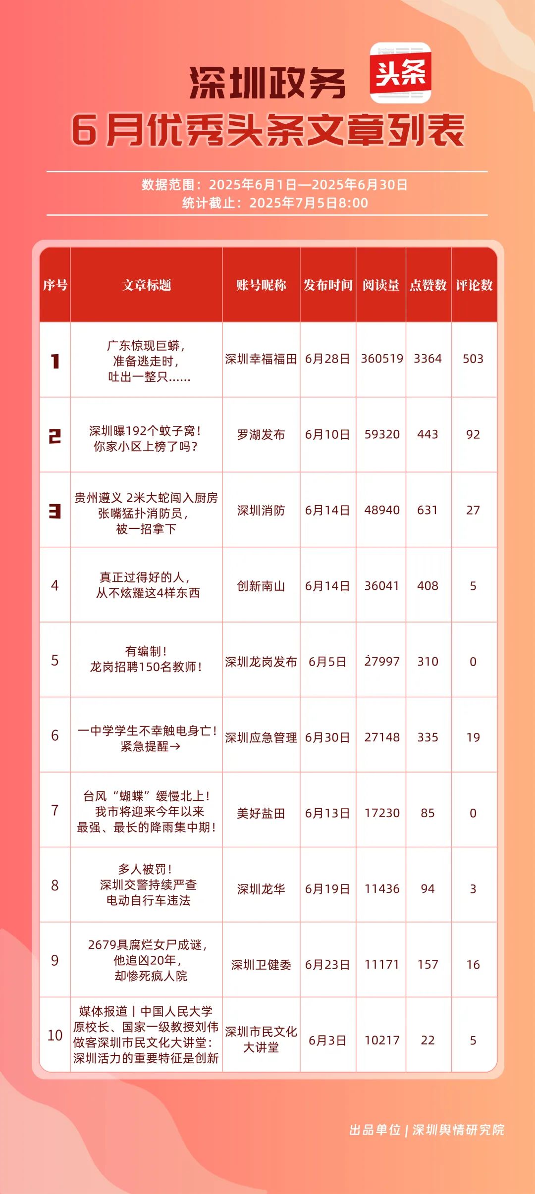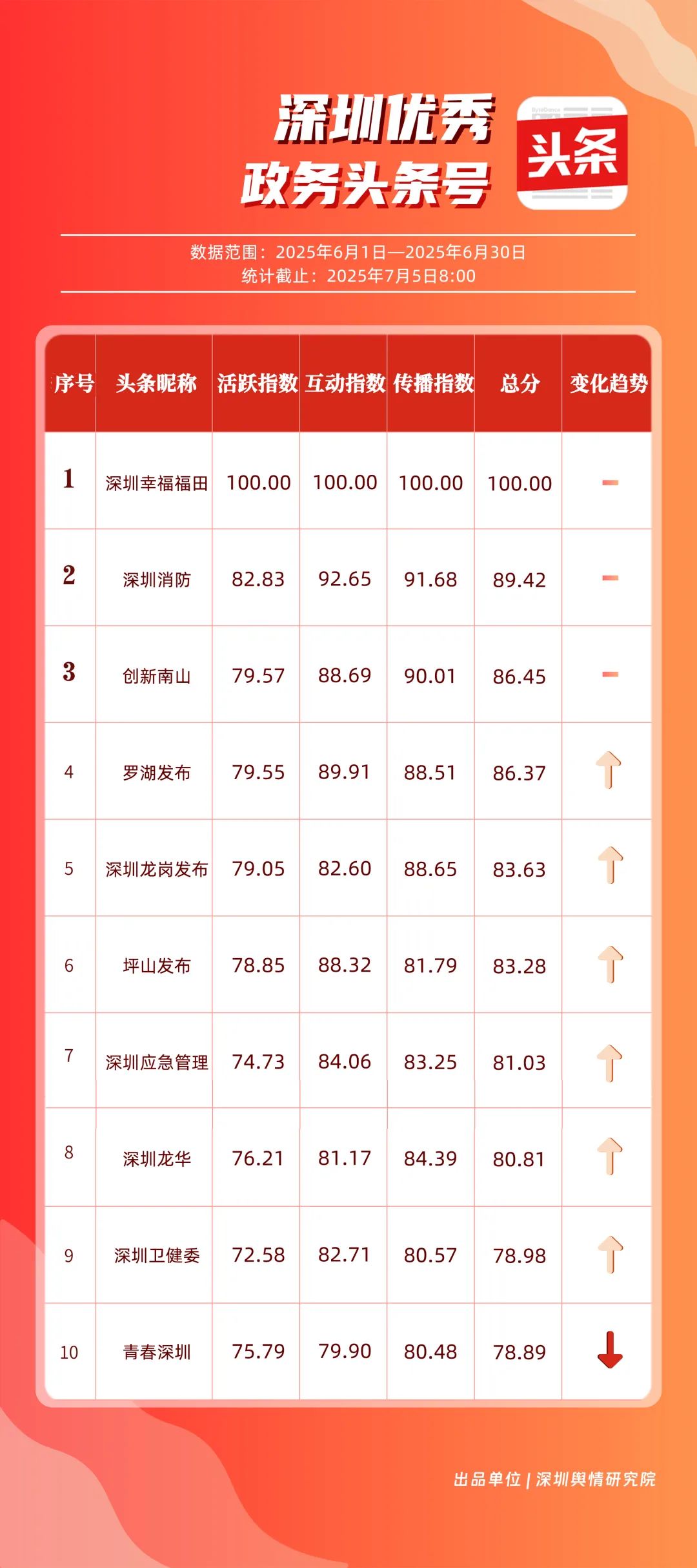 6月,“深圳幸福福田”“深圳消防”“創(chuàng)新南山”“羅湖發(fā)布”“深圳龍崗發(fā)布”“坪山發(fā)布”“深圳應(yīng)急管理”“深圳龍華”“深圳衛(wèi)健委”“青春深圳”共10個(gè)政務(wù)頭條號入選“優(yōu)秀政務(wù)頭條號”榜單。“深圳幸福福田”“深圳消防”“創(chuàng)新南山”連續(xù)位居榜單前3名,內(nèi)容具備較強(qiáng)的吸引力?!傲_湖發(fā)布”“深圳龍崗發(fā)布”排名也在榜單前列,排名較5月有所上升,在區(qū)域形象宣傳與民生服務(wù)中持續(xù)發(fā)力。