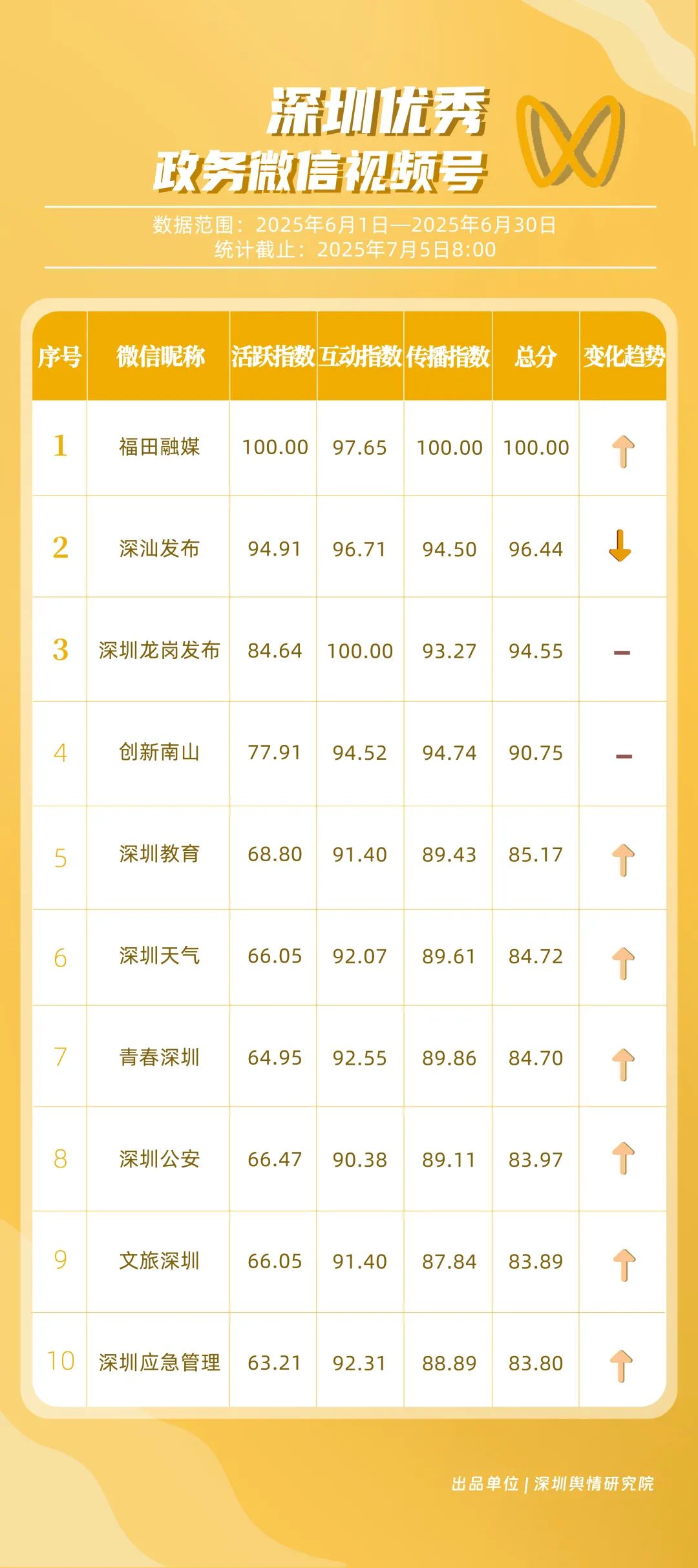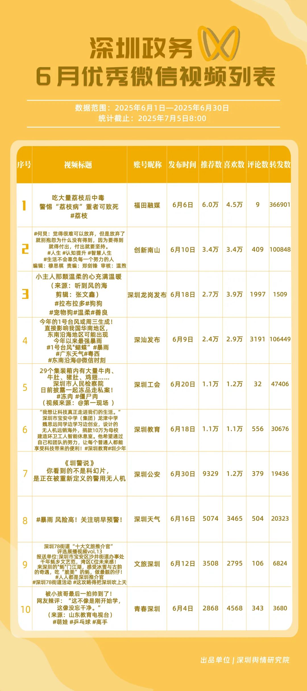 6月,獲得“深圳優(yōu)秀政務(wù)微信視頻號”稱號的是“福田融媒”“深汕發(fā)布”“深圳龍崗發(fā)布”“創(chuàng)新南山”“深圳教育”“深圳天氣”“青春深圳”“深圳公安”“文旅深圳”“深圳應(yīng)急管理”。其中,“福田融媒”以活躍、傳播指數(shù)雙滿分居榜首,其視頻《吃大量荔枝后中毒 警惕“荔枝病”重者可致死》獲得超36萬次轉(zhuǎn)發(fā),成為爆款案例;“深汕發(fā)布”“深圳龍崗發(fā)布”“創(chuàng)新南山”得分在90分以上,在互動(dòng)、傳播方面表現(xiàn)亮眼。這些優(yōu)秀的政務(wù)微信視頻號以各自的獨(dú)特風(fēng)格持續(xù)發(fā)力,為政務(wù)及民生信息傳遞開拓更鮮活、暢通的路徑。