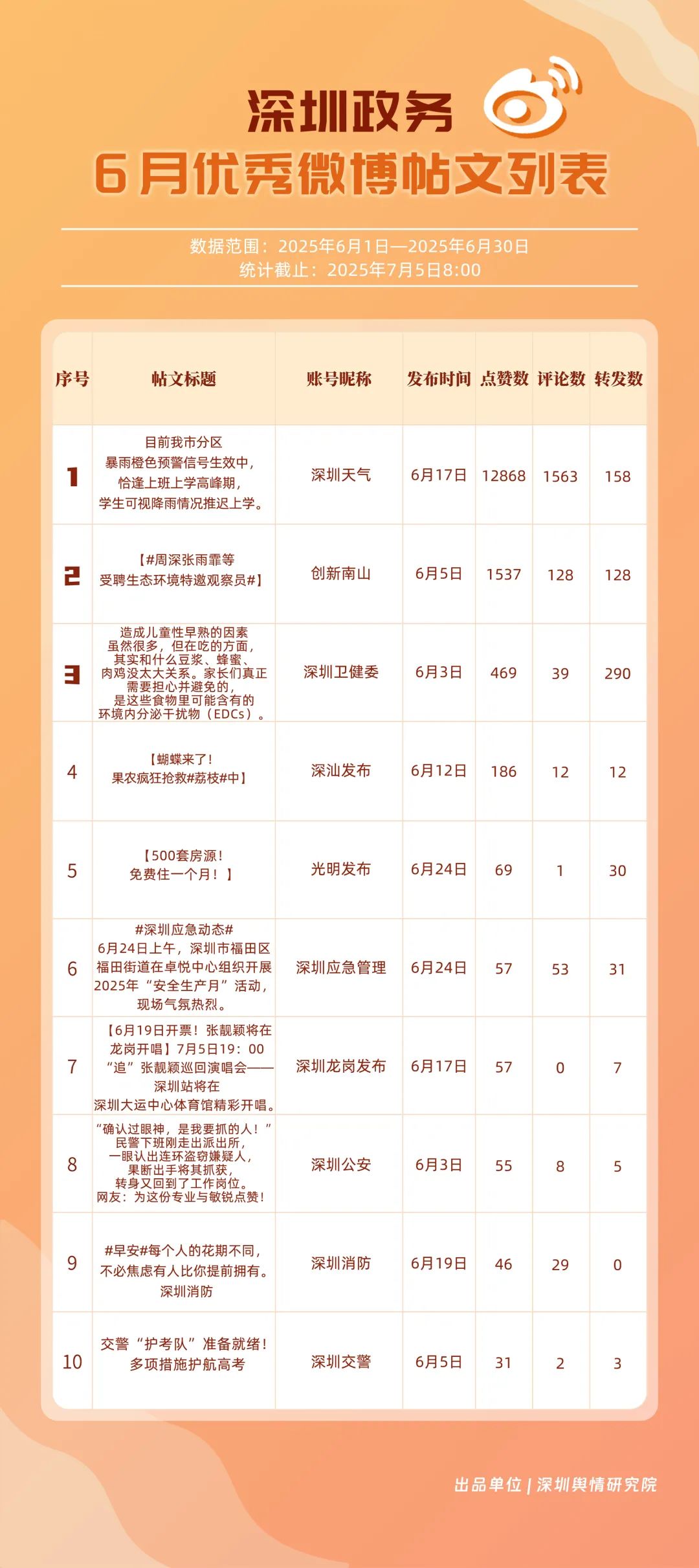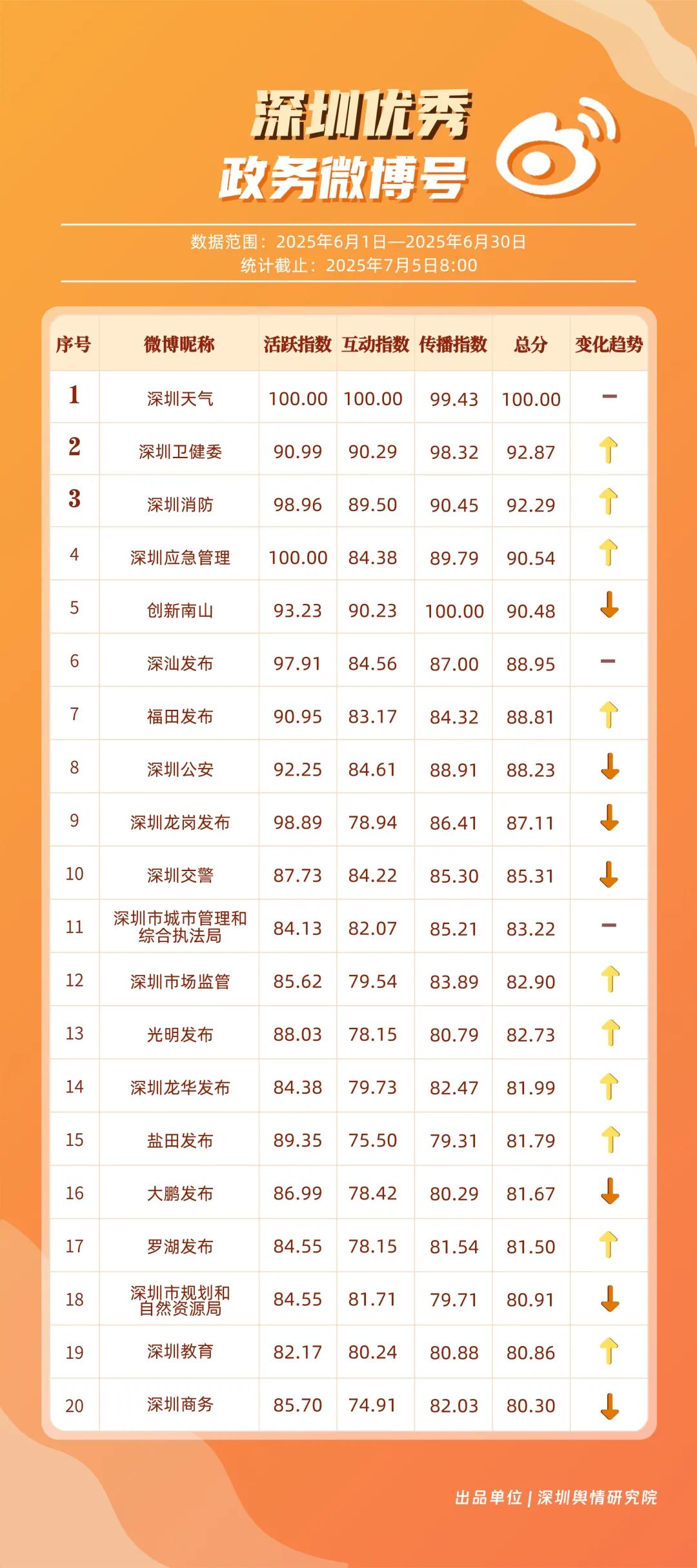 6月,“深圳天氣”“深圳衛(wèi)健委”“深圳消防”“深圳應(yīng)急管理”“創(chuàng)新南山”“深汕發(fā)布”“福田發(fā)布”“深圳公安”“深圳龍崗發(fā)布”“深圳交警”等20個(gè)賬號入選“優(yōu)秀政務(wù)微博號”。其中,“深圳天氣”以活躍、互動(dòng)指數(shù)雙滿分穩(wěn)居第一,氣象服務(wù)信息及時(shí)性與科普內(nèi)容趣味性獲市民高度認(rèn)可;“深圳衛(wèi)健委”“深圳消防”“深圳應(yīng)急管理”分別位列2至4位,通過熱點(diǎn)話題聯(lián)動(dòng)醫(yī)療、消防、應(yīng)急知識科普擴(kuò)大影響力,政務(wù)微博矩陣在突發(fā)事件響應(yīng)與民生服務(wù)中作用凸顯。