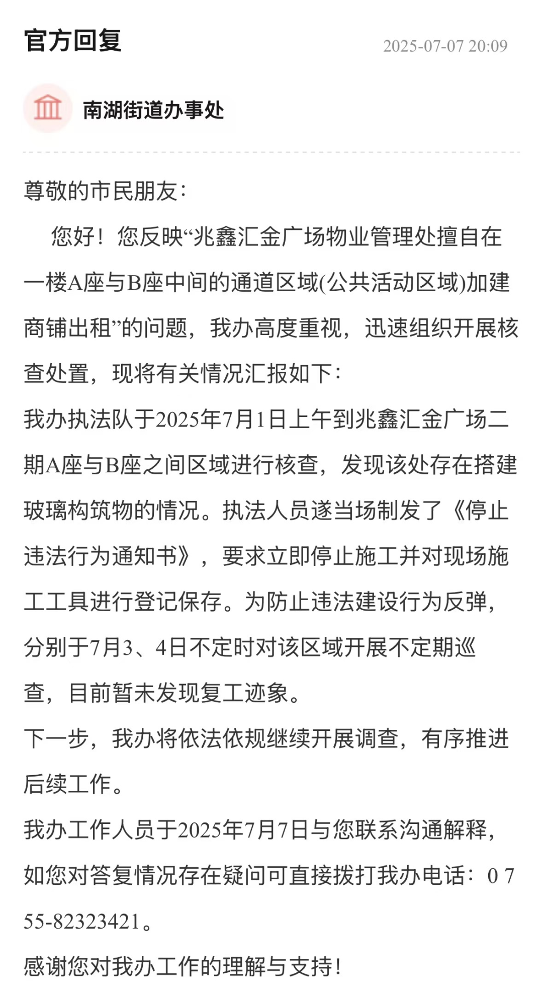 從市民反饋到執(zhí)法處置,羅湖區(qū)南湖街道辦事處以快速響應(yīng)、精準(zhǔn)執(zhí)法展現(xiàn)治理效能。通過現(xiàn)場核查、制發(fā)《停止違法行為通知書》、登記保存施工工具等措施,及時(shí)遏制違法搭建勢(shì)頭,并建立不定期巡查機(jī)制防止反彈。從“即時(shí)制止”到“長效監(jiān)督”的閉環(huán)管理,維護(hù)了業(yè)主合法權(quán)益與消防通道安全,為城市違建治理提供了高效務(wù)實(shí)的實(shí)踐樣本,彰顯基層執(zhí)法部門守護(hù)民生安全的責(zé)任擔(dān)當(dāng)。