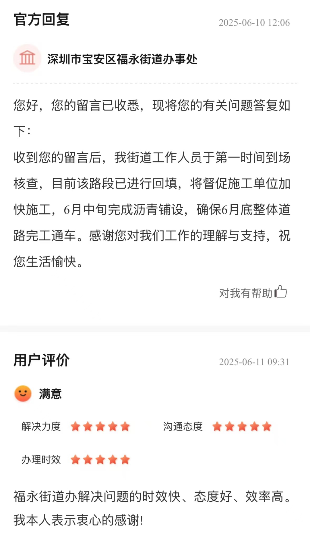 案例點(diǎn)評(píng):道路銜接處的大坑大坎影響通行安全與道路順暢,亟待解決。街道辦收到留言后迅速行動(dòng),第一時(shí)間到場核查,明確將督促施工單位加快進(jìn)度,在預(yù)計(jì)時(shí)間內(nèi)完成瀝青鋪設(shè)及道路整體完工,這些舉措體現(xiàn)了對(duì)道路通行問題的重視和高效的處理能力,為保障道路正常通行提供了有力保障,獲得了市民的滿意評(píng)價(jià)。