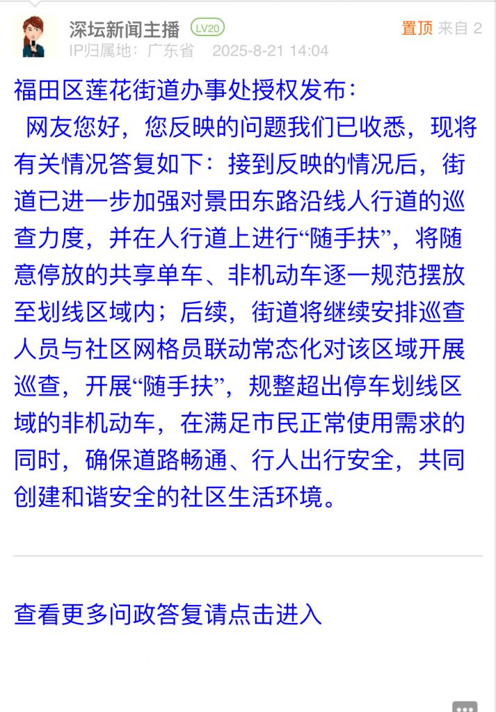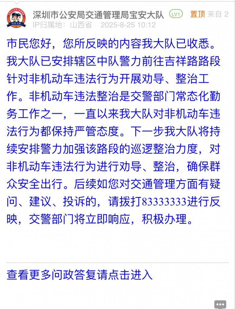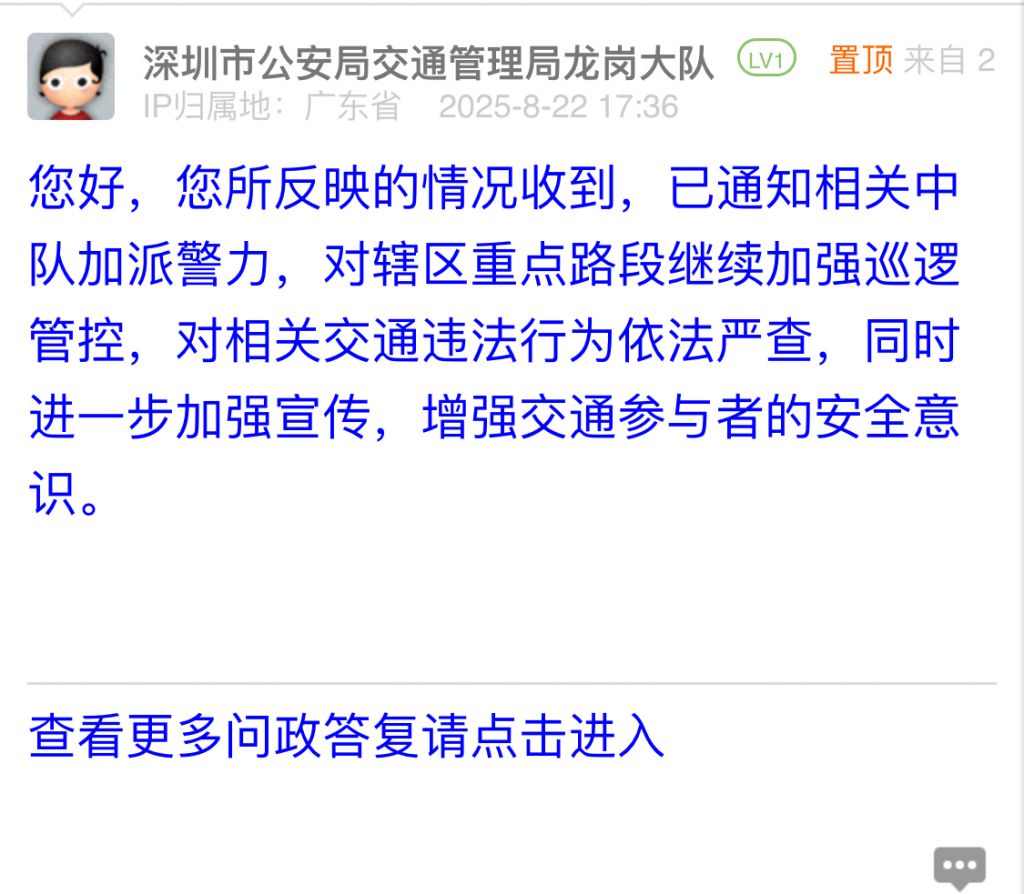 據(jù)統(tǒng)計(jì),2025年8月18日-2025年8月24日,網(wǎng)友在深圳論壇發(fā)布問(wèn)政類帖文共40篇,得到相關(guān)單位正式回應(yīng)的帖文數(shù)為40篇,本期簡(jiǎn)報(bào)回應(yīng)速度最快的單位:市公安局交通管理局寶安大隊(duì)、市公安局交通管理局羅湖大隊(duì)、羅湖區(qū)翠竹街道辦事處、市生態(tài)環(huán)境局寶安管理局、龍崗區(qū)城市管理和綜合執(zhí)法局。