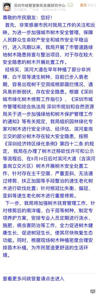 經(jīng)核實(shí),濱河大道在早年種植了部分非洲楝、白千層等速生樹(shù)種,目前已步入衰老期,容易出現(xiàn)樹(shù)干空洞或根部腐爛情況,遇風(fēng)易折斷倒伏,存在安全隱患。根據(jù)《深圳城市綠化樹(shù)木修剪工作指引》、《深圳市城市管理和綜合執(zhí)法局 深圳市規(guī)劃和自然資源局關(guān)于進(jìn)一步加強(qiáng)綠地和樹(shù)木保護(hù)管理工作的通知》等有關(guān)規(guī)定,我局組織園林綠化專家對(duì)樹(shù)木進(jìn)行安全評(píng)估,經(jīng)評(píng)估,濱河皇崗立交的部分樹(shù)木存在較大安全隱患,按照《深圳經(jīng)濟(jì)特區(qū)綠化條例》第四十二條 的規(guī)定, 我局在辦理了樹(shù)木遷移砍伐許可和公示等流程后,在8月10日后對(duì)濱河大道(含濱河皇崗立交片區(qū))樹(shù)木開(kāi)展樹(shù)木安全處置工作,針對(duì)存在主干空腐、嚴(yán)重歪斜,無(wú)法通過(guò)修剪、扶正加固等手段整治的速生老化樹(shù)木進(jìn)行砍伐處置;針對(duì)根冠比失衡、偏冠、歪斜等速生老化樹(shù)木進(jìn)行重度修剪。