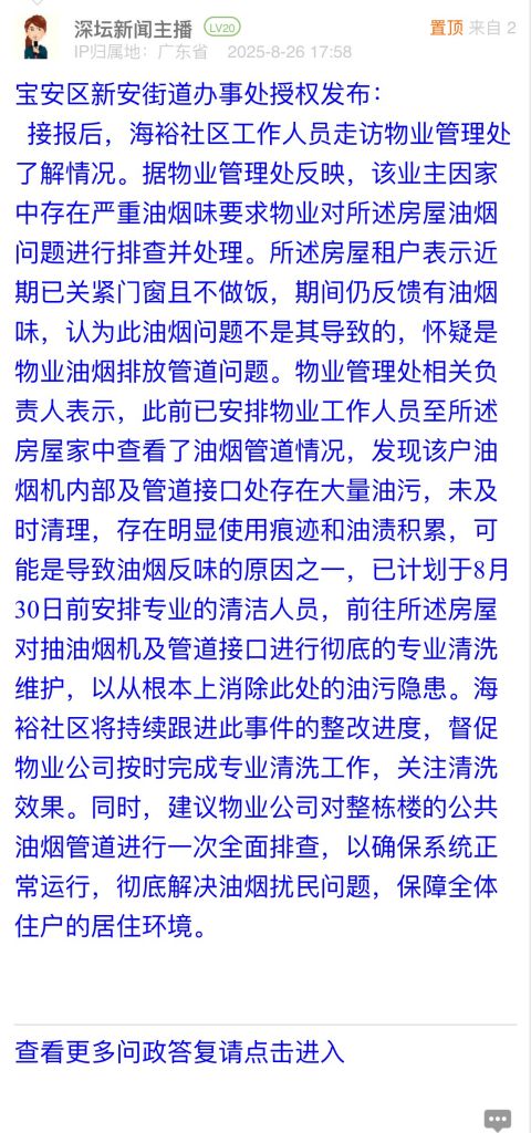 接報(bào)后,海裕社區(qū)工作人員走訪物業(yè)管理處了解情況。據(jù)物業(yè)管理處反映,該業(yè)主因家中存在嚴(yán)重油煙味要求物業(yè)對(duì)所述房屋油煙問(wèn)題進(jìn)行排查并處理。所述房屋租戶表示近期已關(guān)緊門窗且不做飯,期間仍反饋有油煙味,認(rèn)為此油煙問(wèn)題不是其導(dǎo)致的,懷疑是物業(yè)油煙排放管道問(wèn)題。物業(yè)管理處相關(guān)負(fù)責(zé)人表示,此前已安排物業(yè)工作人員至所述房屋家中查看了油煙管道情況,發(fā)現(xiàn)該戶油煙機(jī)內(nèi)部及管道接口處存在大量油污,未及時(shí)清理,存在明顯使用痕跡和油漬積累,可能是導(dǎo)致油煙反味的原因之一,已計(jì)劃于8月30日前安排專業(yè)的清潔人員,前往所述房屋對(duì)抽油煙機(jī)及管道接口進(jìn)行徹底的專業(yè)清洗維護(hù),以從根本上消除此處的油污隱患。海裕社區(qū)將持續(xù)跟進(jìn)此事件的整改進(jìn)度,督促物業(yè)公司按時(shí)完成專業(yè)清洗工作,關(guān)注清洗效果。同時(shí),建議物業(yè)公司對(duì)整棟樓的公共油煙管道進(jìn)行一次全面排查,以確保系統(tǒng)正常運(yùn)行,徹底解決油煙擾民問(wèn)題,保障全體住戶的居住環(huán)境。