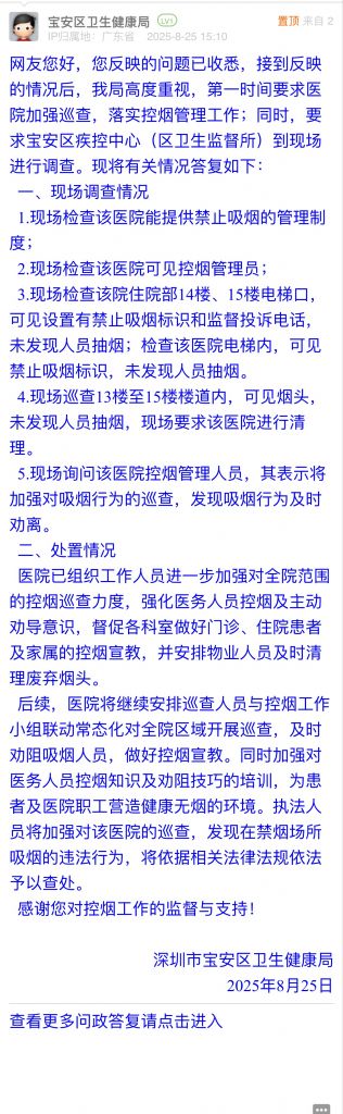 網(wǎng)友您好,您反映的問(wèn)題已收悉,接到反映的情況后,我局高度重視,第一時(shí)間要求醫(yī)院加強(qiáng)巡查,落實(shí)控?zé)煿芾砉ぷ?;同時(shí),要求寶安區(qū)疾控中心(區(qū)衛(wèi)生監(jiān)督所)到現(xiàn)場(chǎng)進(jìn)行調(diào)查?,F(xiàn)將有關(guān)情況答復(fù)如下: