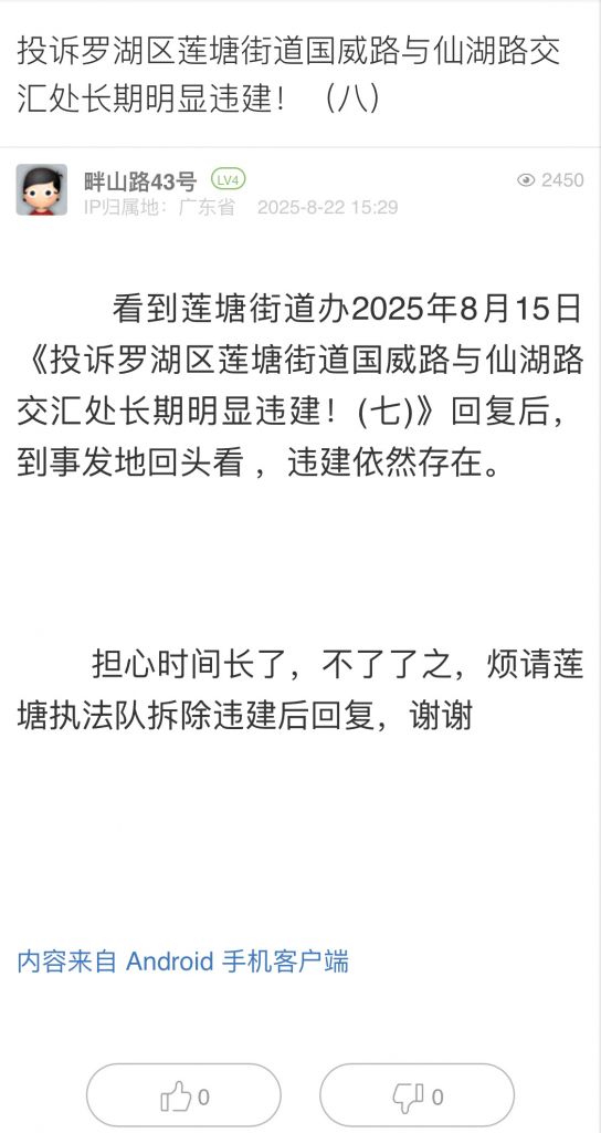 29. 帖文《投訴羅湖區(qū)蓮塘街道國(guó)威路與仙湖路交匯處長(zhǎng)期明顯違建?。ò耍?/a>》