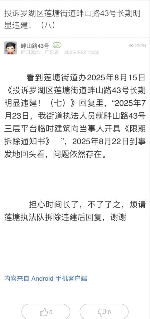 30. 帖文《投訴羅湖區(qū)蓮塘街道畔山路43號(hào)長(zhǎng)期明顯違建!(八)》