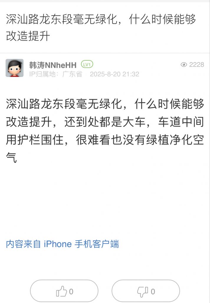 13. 帖文《深汕路龍東段毫無(wú)綠化,什么時(shí)候能夠改造提升》