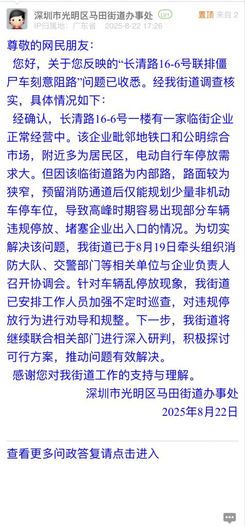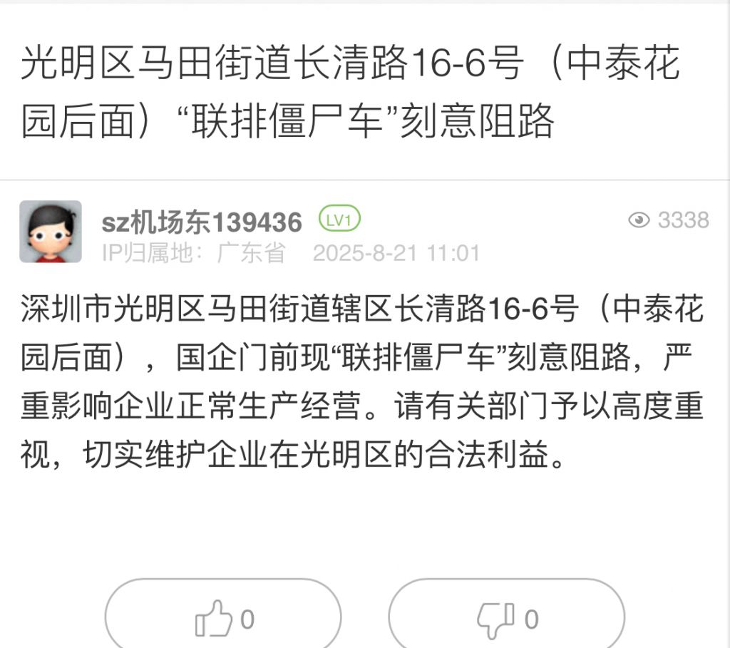 19. 帖文《光明區(qū)馬田街道長(zhǎng)清路16-6號(hào)(中泰花園后面)“聯(lián)排僵尸車”刻意阻路》