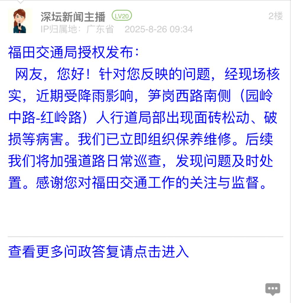 34. 帖文《筍崗西路南側(cè)靠近園嶺新村人行道多處破損和松動(dòng)》