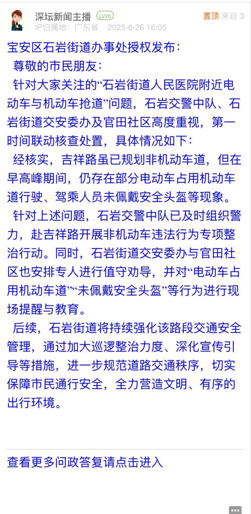 針對(duì)大家關(guān)注的“石巖街道人民醫(yī)院附近電動(dòng)車與機(jī)動(dòng)車搶道”問(wèn)題,石巖交警中隊(duì)、石巖街道交安委辦及官田社區(qū)高度重視,第一時(shí)間聯(lián)動(dòng)核查處置,具體情況如下: