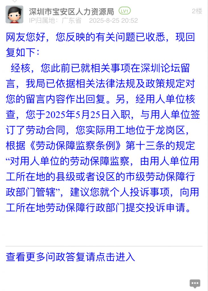 經(jīng)核,您此前已就相關(guān)事項(xiàng)在深圳論壇留言,我局已依據(jù)相關(guān)法律法規(guī)及政策規(guī)定對(duì)您的留言內(nèi)容作出回復(fù)。另,經(jīng)用人單位核查,您于2025年5月25日入職,與用人單位簽訂了勞動(dòng)合同,您實(shí)際用工地位于龍崗區(qū),根據(jù)《勞動(dòng)保障監(jiān)察條例》第十三條的規(guī)定“對(duì)用人單位的勞動(dòng)保障監(jiān)察,由用人單位用工所在地的縣級(jí)或者設(shè)區(qū)的市級(jí)勞動(dòng)保障行政部門管轄”,建議您就個(gè)人投訴事項(xiàng),向用工所在地勞動(dòng)保障行政部門提交投訴申請(qǐng)。