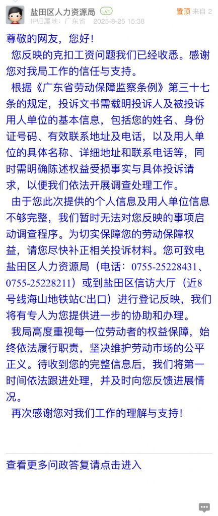 由于您此次提供的個(gè)人信息及用人單位信息不夠完整,我們暫時(shí)無(wú)法對(duì)您反映的事項(xiàng)啟動(dòng)調(diào)查程序。為切實(shí)保障您的勞動(dòng)保障權(quán)益,請(qǐng)您盡快補(bǔ)正相關(guān)投訴材料。您可致電鹽田區(qū)人力資源局(電話:0755-25228431、0755-25228211)或到鹽田區(qū)信訪大廳(近8號(hào)線海山地鐵站C出口)進(jìn)行登記反映,我們將有專人為您提供進(jìn)一步的協(xié)助和辦理。