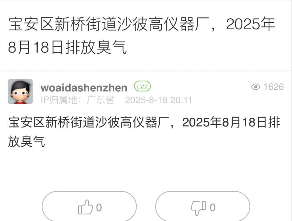 4. 帖文《寶安區(qū)新橋街道沙彼高儀器廠,2025年8月18日排放臭氣》
