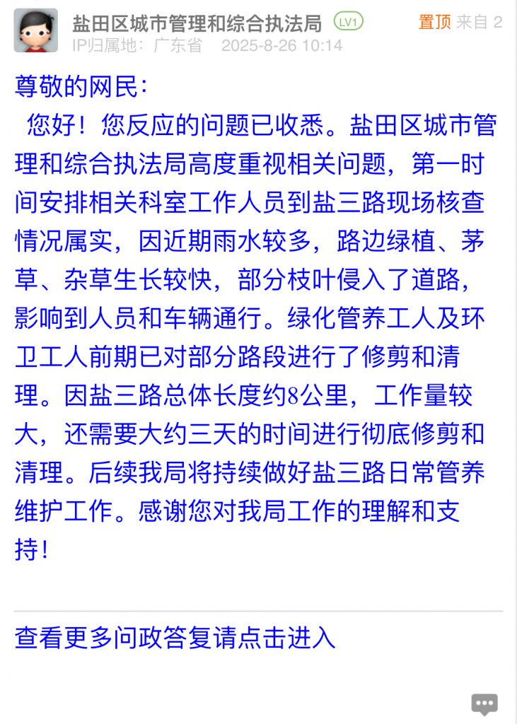 您好!您反應(yīng)的問(wèn)題已收悉。鹽田區(qū)城市管理和綜合執(zhí)法局高度重視相關(guān)問(wèn)題,第一時(shí)間安排相關(guān)科室工作人員到鹽三路現(xiàn)場(chǎng)核查情況屬實(shí),因近期雨水較多,路邊綠植、茅草、雜草生長(zhǎng)較快,部分枝葉侵入了道路,影響到人員和車輛通行。綠化管養(yǎng)工人及環(huán)衛(wèi)工人前期已對(duì)部分路段進(jìn)行了修剪和清理。因鹽三路總體長(zhǎng)度約8公里,工作量較大,還需要大約三天的時(shí)間進(jìn)行徹底修剪和清理。后續(xù)我局將持續(xù)做好鹽三路日常管養(yǎng)維護(hù)工作。感謝您對(duì)我局工作的理解和支持!