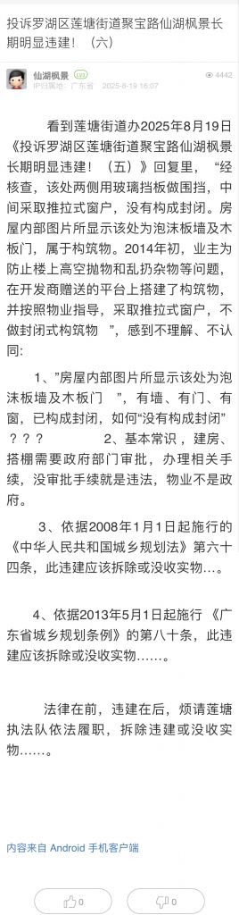 3. 帖文《投訴羅湖區(qū)蓮塘街道聚寶路仙湖楓景長(zhǎng)期明顯違建?。ㄎ澹?/a>》