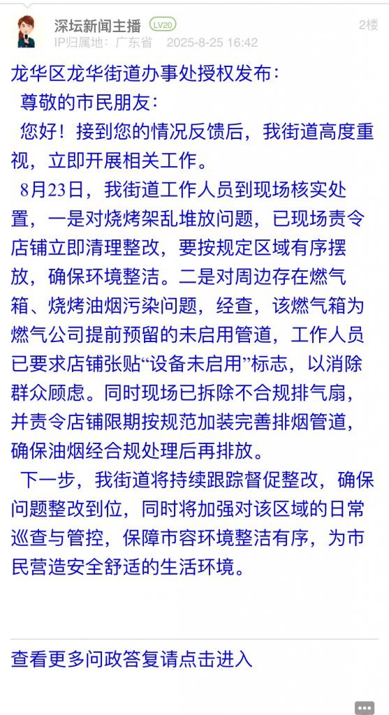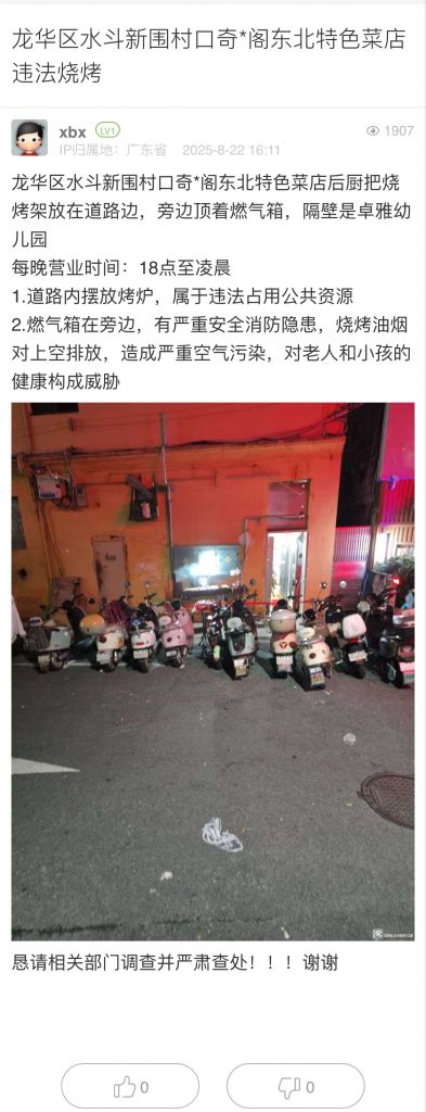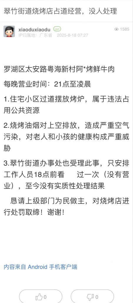 1. 帖文《翠竹街道燒烤店占道經(jīng)營(yíng),沒(méi)人處理》