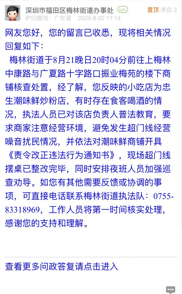 梅林街道于8月21晚日20時(shí)04分前往上梅林中康路與廣夏路十字路口振業(yè)梅苑的樓下商鋪核查處置,經(jīng)了解,您反映的小吃店為忠生潮味鮮炒粉店,有時(shí)存在食客喝酒的情況,執(zhí)法人員已對(duì)該店負(fù)責(zé)人普法教育,要求商家注意經(jīng)營(yíng)環(huán)境,避免發(fā)生超門線經(jīng)營(yíng)噪音擾民情況,并依法對(duì)潮味鮮商鋪開(kāi)具《責(zé)令改正違法行為通知書》,現(xiàn)場(chǎng)超門線擺桌已整改完畢,同時(shí)安排夜班人員加強(qiáng)巡查勸導(dǎo)。如您有其他需要反饋或協(xié)調(diào)的事項(xiàng),可直接電話聯(lián)系梅林街道執(zhí)法隊(duì):0755-83318969,工作人員將第一時(shí)間核實(shí)處理,感謝您的支持和理解。