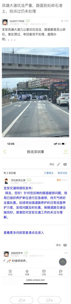20. 帖文《鳳塘大道坑洼嚴(yán)重,路面到處碎石渣土,投訴過(guò)仍未處理》