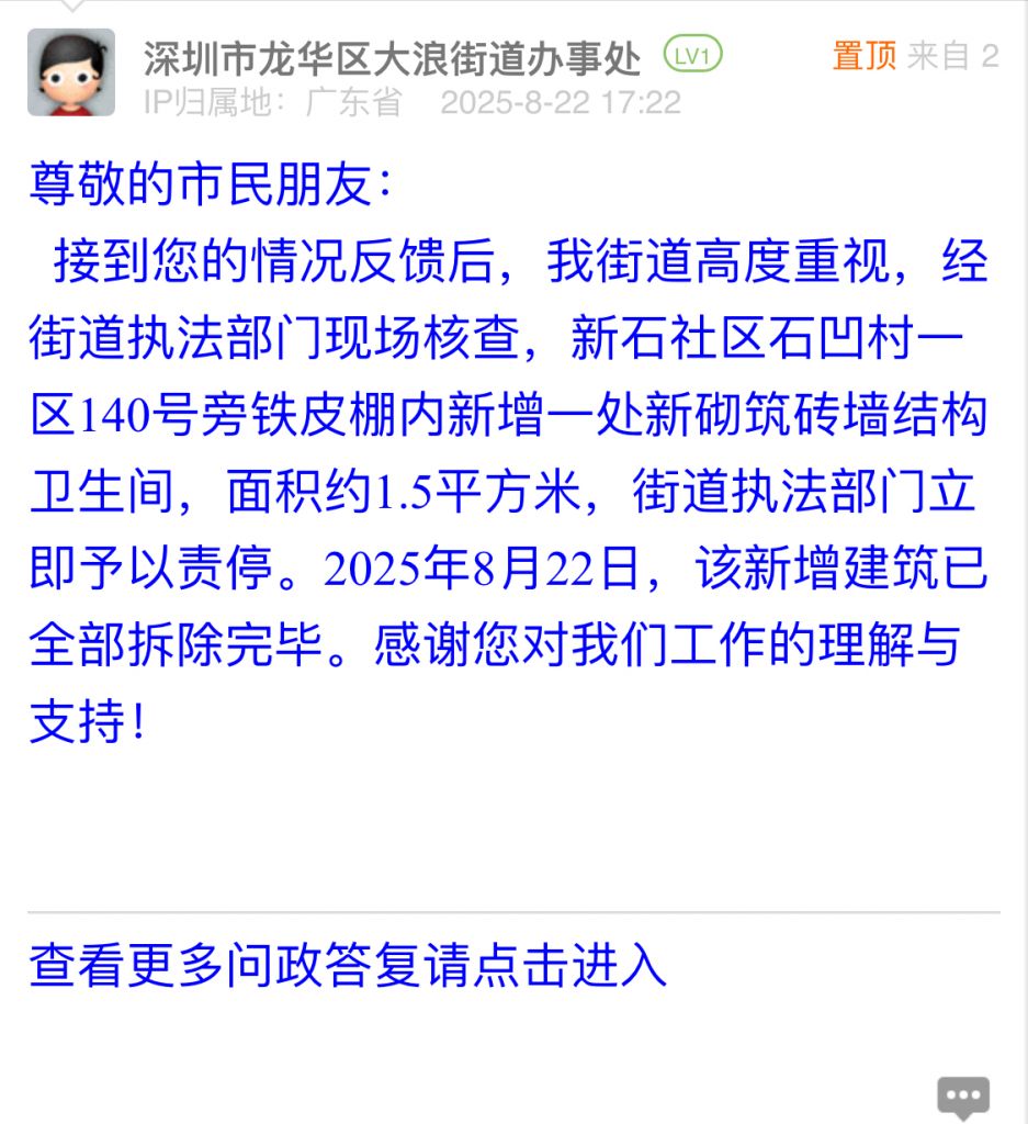 接到您的情況反饋后,我街道高度重視,經(jīng)街道執(zhí)法部門現(xiàn)場(chǎng)核查,新石社區(qū)石凹村一區(qū)140號(hào)旁鐵皮棚內(nèi)新增一處新砌筑磚墻結(jié)構(gòu)衛(wèi)生間,面積約1.5平方米,街道執(zhí)法部門立即予以責(zé)停。2025年8月22日,該新增建筑已全部拆除完畢。感謝您對(duì)我們工作的理解與支持!