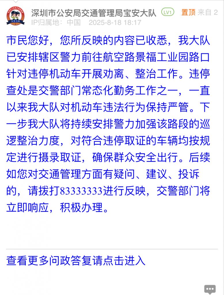 市民您好,您所反映的內(nèi)容已收悉,我大隊(duì)已安排轄區(qū)警力前往航空路景福工業(yè)園路口針對(duì)違停機(jī)動(dòng)車開(kāi)展勸離、整治工作。違停查處是交警部門常態(tài)化勤務(wù)工作之一,一直以來(lái)我大隊(duì)對(duì)機(jī)動(dòng)車違法行為保持嚴(yán)管。下一步我大隊(duì)將持續(xù)安排警力加強(qiáng)該路段的巡邏整治力度,對(duì)符合違停取證的車輛均按規(guī)定進(jìn)行攝錄取證,確保群眾安全出行。后續(xù)如您對(duì)交通管理方面有疑問(wèn)、建議、投訴的,請(qǐng)撥打83333333進(jìn)行反映,交警部門將立即響應(yīng),積極辦理。