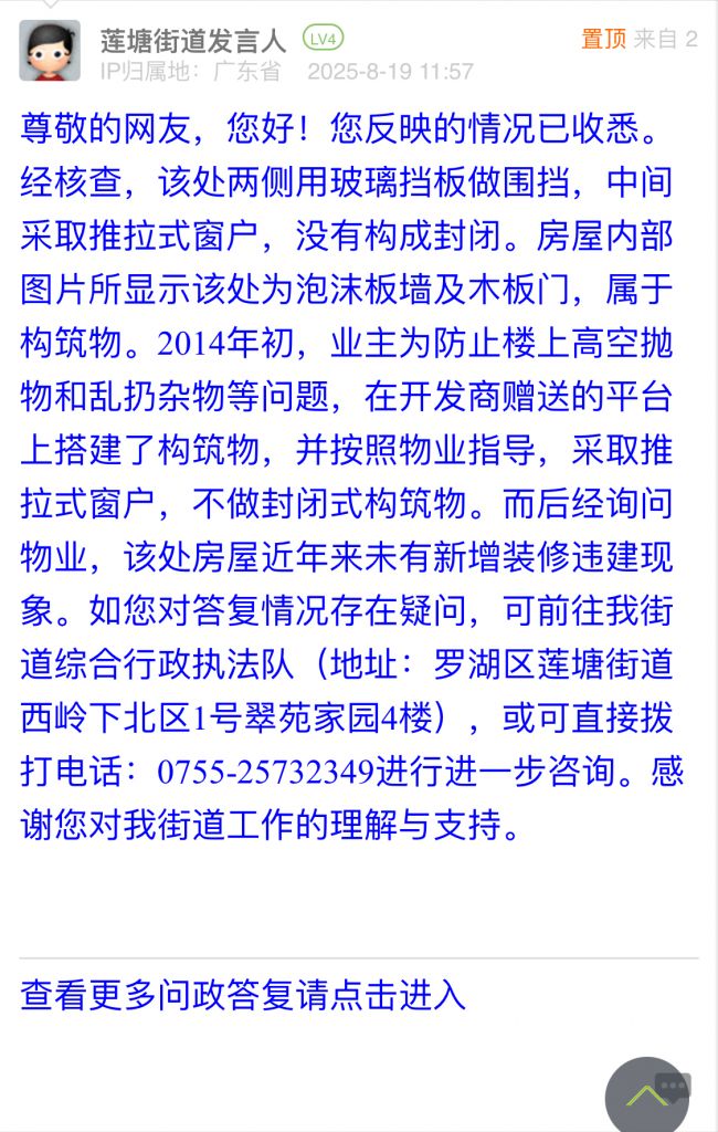 10. 帖文《投訴羅湖區(qū)蓮塘街道聚寶路仙湖楓景長(zhǎng)期明顯違建?。?/a>》