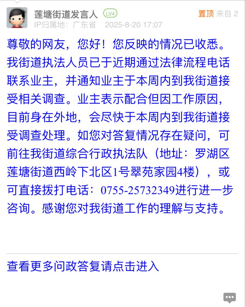 尊敬的網(wǎng)友,您好!您反映的問(wèn)題已收悉。我街道已按照法律流程,向當(dāng)事人送達(dá)相關(guān)法律文書,并按照文書內(nèi)容,告知當(dāng)事人帶上相關(guān)資料在規(guī)定期限內(nèi)到我街道接受處理。如您對(duì)答復(fù)情況存在疑問(wèn),可前往我街道綜合行政執(zhí)法隊(duì)(地址:羅湖區(qū)蓮塘街道西嶺下北區(qū)1號(hào)翠苑家園4樓),或可直接撥打電話:0755-25732349進(jìn)行進(jìn)一步咨詢。感謝您對(duì)我街道工作的理解與支持。