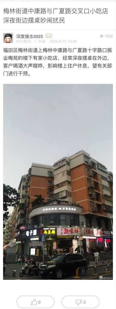 17. 帖文《梅林街道中康路與廣夏路交叉口小吃店深夜街邊擺桌吵鬧擾民》