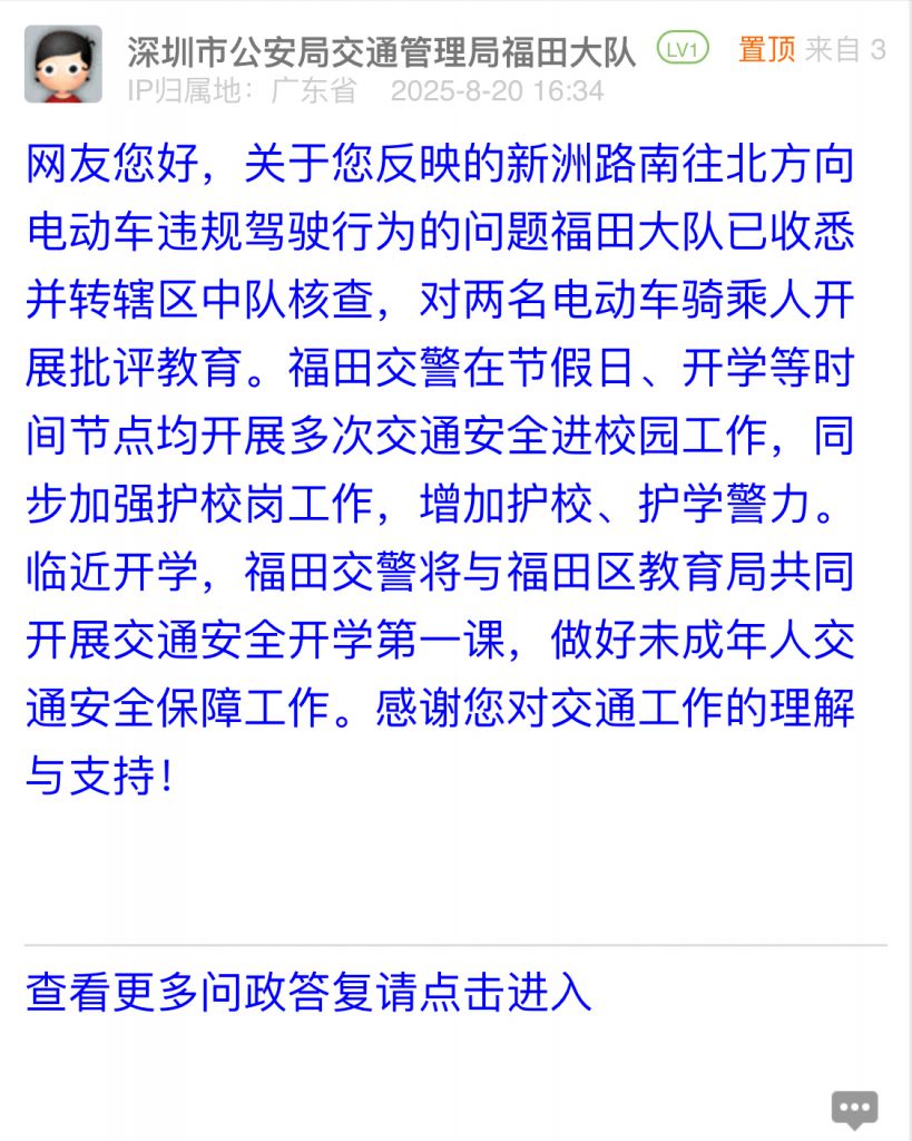 網(wǎng)友您好,關(guān)于您反映的新洲路南往北方向電動(dòng)車違規(guī)駕駛行為的問(wèn)題福田大隊(duì)已收悉并轉(zhuǎn)轄區(qū)中隊(duì)核查,對(duì)兩名電動(dòng)車騎乘人開(kāi)展批評(píng)教育。福田交警在節(jié)假日、開(kāi)學(xué)等時(shí)間節(jié)點(diǎn)均開(kāi)展多次交通安全進(jìn)校園工作,同步加強(qiáng)護(hù)校崗工作,增加護(hù)校、護(hù)學(xué)警力。臨近開(kāi)學(xué),福田交警將與福田區(qū)教育局共同開(kāi)展交通安全開(kāi)學(xué)第一課,做好未成年人交通安全保障工作。感謝您對(duì)交通工作的理解與支持!
