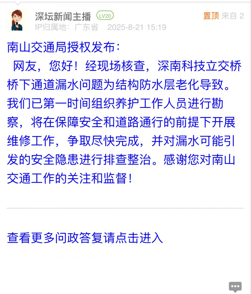 9. 帖文《南山科技路深南科技立交橋橋洞漏水可能有隱患》