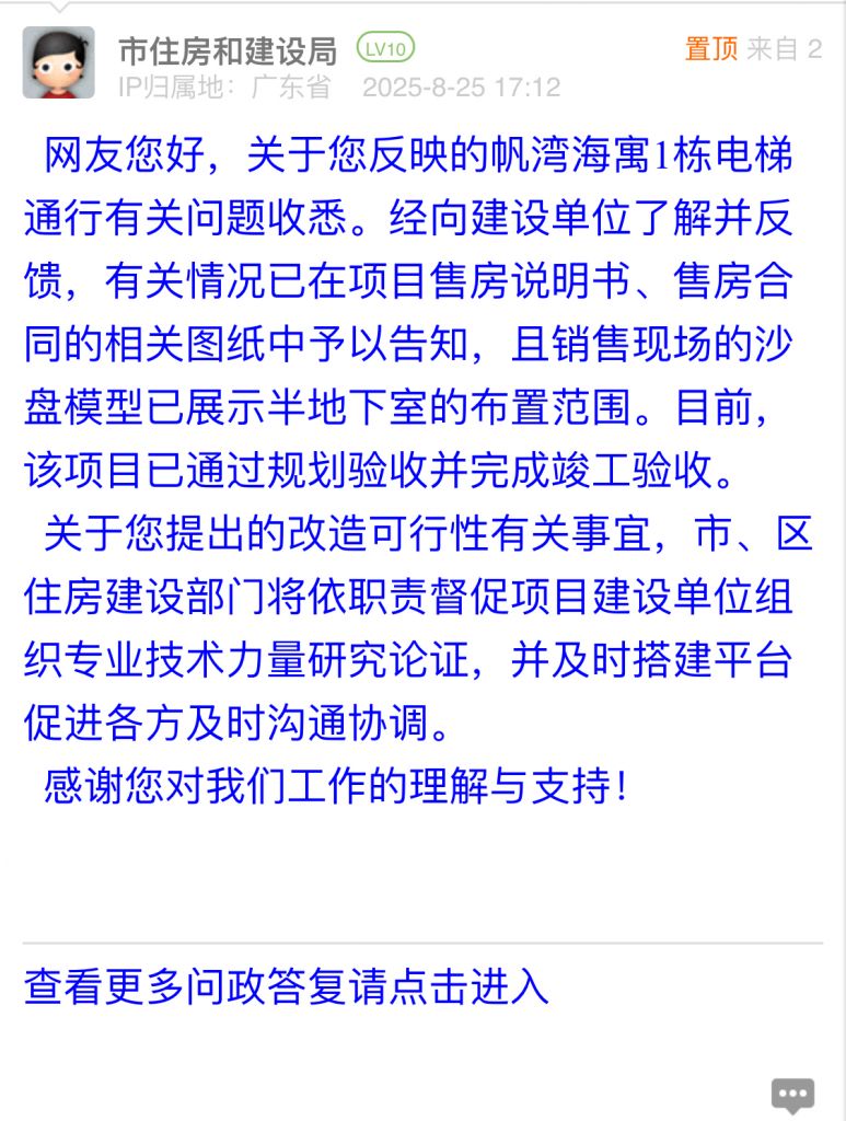 網(wǎng)友您好,關(guān)于您反映的帆灣海寓1棟電梯通行有關(guān)問(wèn)題收悉。經(jīng)向建設(shè)單位了解并反饋,有關(guān)情況已在項(xiàng)目售房說(shuō)明書、售房合同的相關(guān)圖紙中予以告知,且銷售現(xiàn)場(chǎng)的沙盤模型已展示半地下室的布置范圍。目前,該項(xiàng)目已通過(guò)規(guī)劃驗(yàn)收并完成竣工驗(yàn)收。