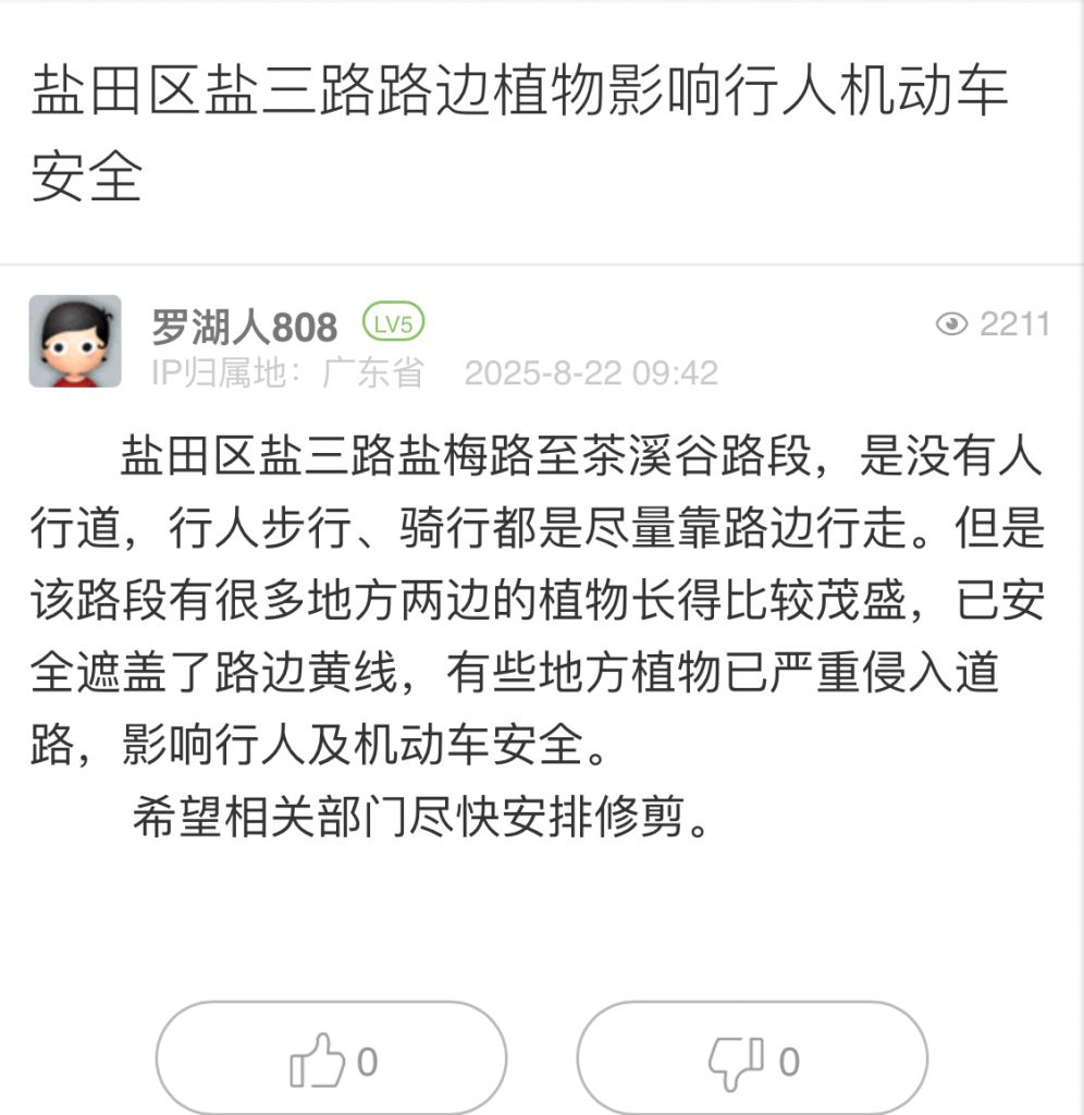 26. 帖文《鹽田區(qū)鹽三路路邊植物影響行人機(jī)動(dòng)車安全》