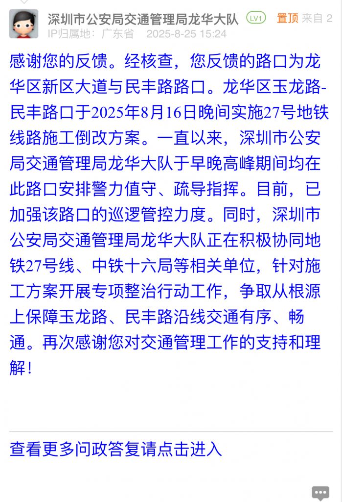 感謝您的反饋。經(jīng)核查,您反饋的路口為龍華區(qū)新區(qū)大道與民豐路路口。龍華區(qū)玉龍路-民豐路口于2025年8月16日晚間實(shí)施27號(hào)地鐵線路施工倒改方案。一直以來(lái),深圳市公安局交通管理局龍華大隊(duì)于早晚高峰期間均在此路口安排警力值守、疏導(dǎo)指揮。目前,已加強(qiáng)該路口的巡邏管控力度。同時(shí),深圳市公安局交通管理局龍華大隊(duì)正在積極協(xié)同地鐵27號(hào)線、中鐵十六局等相關(guān)單位,針對(duì)施工方案開(kāi)展專項(xiàng)整治行動(dòng)工作,爭(zhēng)取從根源上保障玉龍路、民豐路沿線交通有序、暢通。再次感謝您對(duì)交通管理工作的支持和理解!