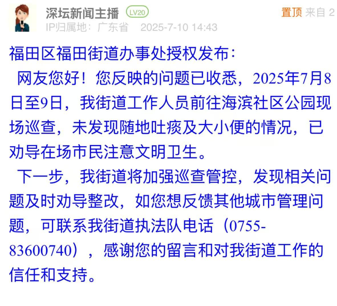 優(yōu)化建議:街道辦接到市民關(guān)于公園衛(wèi)生問題的反映后,到現(xiàn)場核查稱未發(fā)現(xiàn)相關(guān)情況,僅對在場市民進(jìn)行文明勸導(dǎo)。但核查時段與問題高發(fā)期可能存在錯位,建議相關(guān)單位優(yōu)化接訴即辦機(jī)制,精準(zhǔn)對接市民反映的高發(fā)時段。若投訴情況不實,相關(guān)部門可主動展示相關(guān)區(qū)域照片及巡查記錄,以可視化方式回應(yīng)市民關(guān)切,切實提升基層治理的透明度與公信力。
