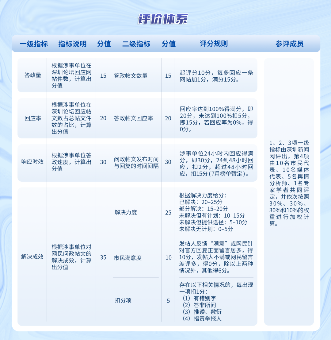 “問政深圳紅黑榜”具有科學(xué)、合理、完備的綜合評價體系,能夠綜合評估深圳各級黨政機(jī)關(guān)和公共企事業(yè)單位的答政情況。