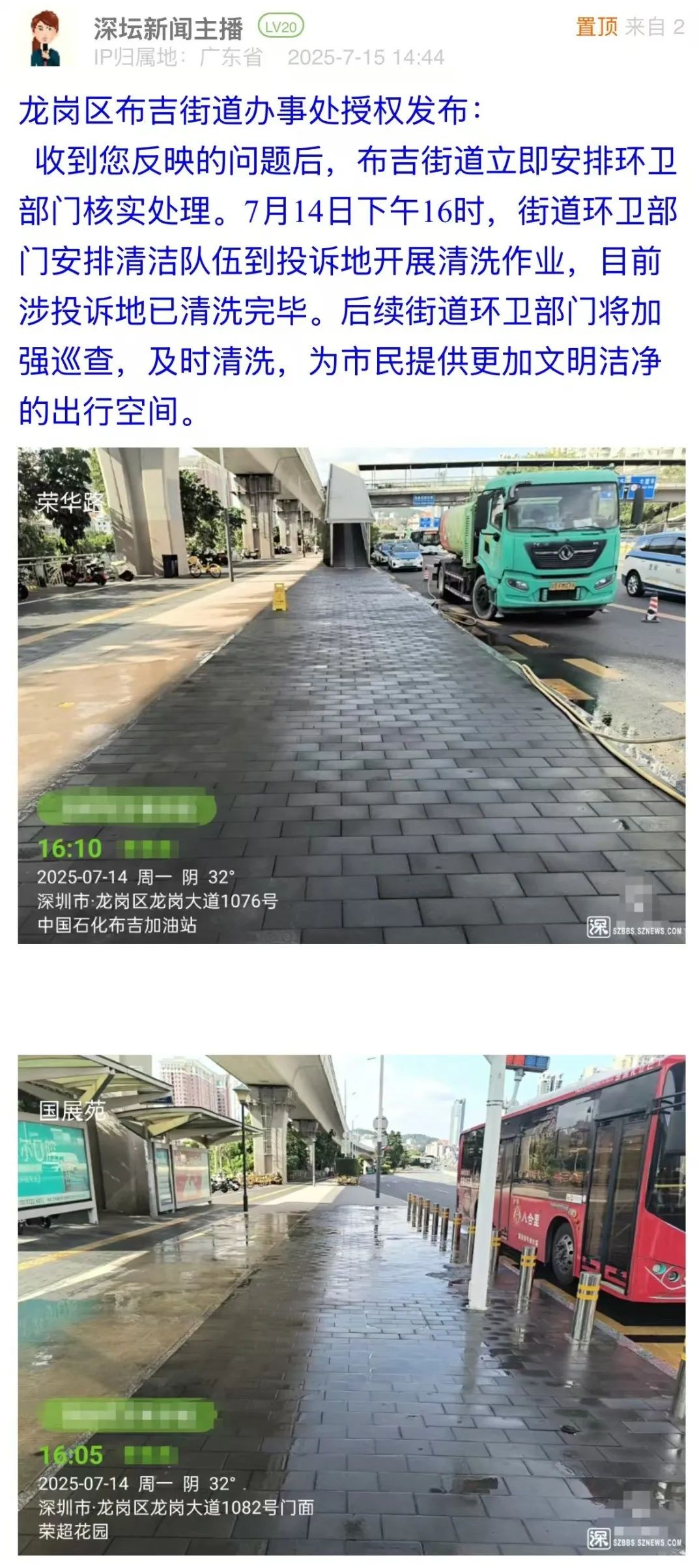 案例點(diǎn)評:對于市民反映的路面油污問題,布吉街道辦立即安排環(huán)衛(wèi)部門進(jìn)行清洗,并于第二日在問政帖文下進(jìn)行回復(fù),以現(xiàn)場圖片展示路面清理效果,表示將加強(qiáng)后續(xù)巡查。此次處置展現(xiàn)了基層部門高效務(wù)實的問題處理能力,為城市道路環(huán)境管理提供了快速響應(yīng)與長效維護(hù)相結(jié)合的實踐范例,切實回應(yīng)了市民對潔凈環(huán)境的期待。