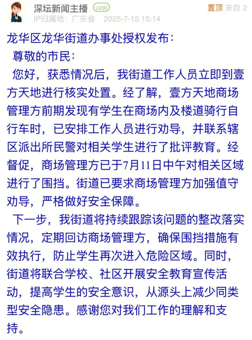 面對商場內(nèi)學(xué)生的騎行安全隱患,龍華街道辦迅速啟動應(yīng)急處置機(jī)制,經(jīng)現(xiàn)場核實后,通過區(qū)域圍擋和批評教育及時控制風(fēng)險,并強(qiáng)化商場值守。處置過程中既采取即時管控手段,又推動建立學(xué)校、社區(qū)聯(lián)動的安全教育長效機(jī)制,為公共場所中未成年人行為的規(guī)范管理提供了務(wù)實有效的解決方案。